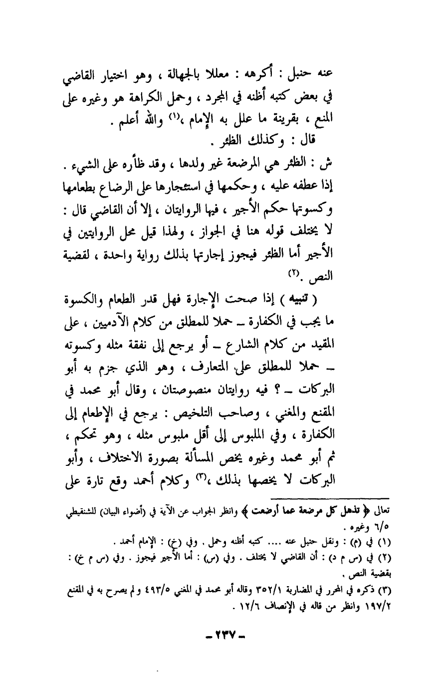 (تنبيه) : إذا صحت الإجارة فهل قدر الطعام والكسوة ما يجب في الكفارة - حملا للمطلق من كلام الآدميين، على المقيد من كلام الشارع - أو يرجع إلى نفقة مثله وكسوته - حملا للمطلق على المتعارف، وهو الذي جزم به أبو البركات؟ فيه روايتان منصوصتان، وقال أبو محمد في المقنع والمغني، وصاحب التلخيص: يرجع في الإطعام إلى الكفارة، وفي الملبوس إلى أقل ملبوس مثله، وهو تحكم، ثم أبو محمد وغيره يخص المسألة بصورة الاختلاف، وأبو البركات لا يخصها بذلك، وكلام أحمد وقع تارة على