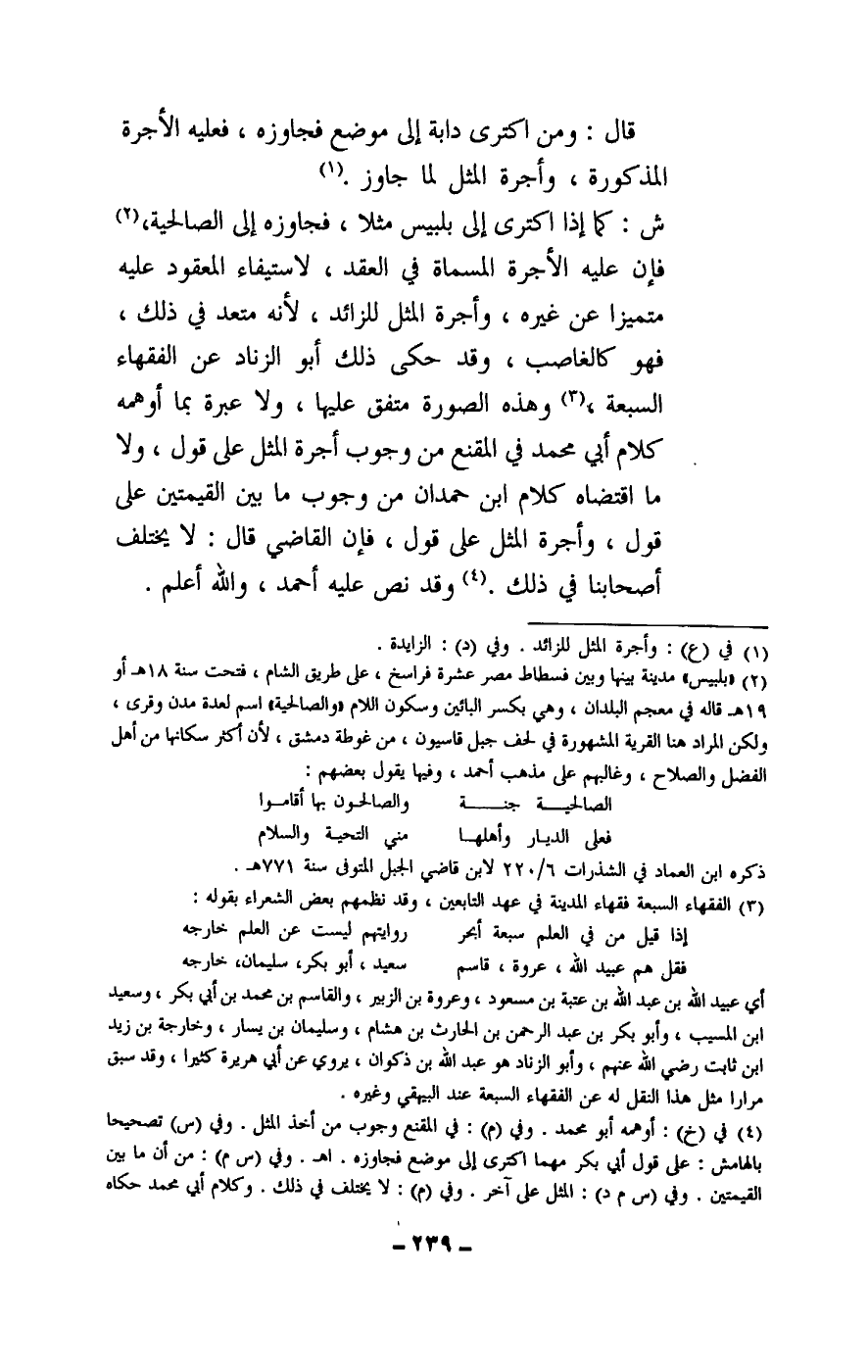 ش: كما إذا اكترى إلى بلبيس مثلا، فجاوزه إلى الصالحية، فإن عليه الأجرة المسماة في العقد، لاستيفاء المعقود عليه متميزا عن غيره، وأجرة المثل للزائد، لأنه متعد في ذلك، فهو كالغاصب، وقد حكى ذلك أبو الزناد عن الفقهاء السبعة، وهذه الصورة متفق عليها، ولا عبرة بما أوهمه كلام أبي محمد في المقنع من وجوب أجرة المثل على قول، ولا ما اقتضاه كلام ابن حمدان من وجوب ما بين القيمتين على قول، وأجرة المثل على قول، فإن القاضي قال: لا يختلف أصحابنا في ذلك. وقد نص عليه أحمد، والله أعلم.