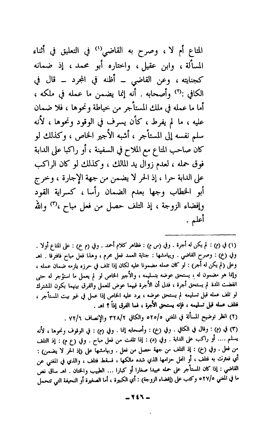 المتاع أم لا، وصرح به القاضي في التعليق في أثناء المسألة، وابن عقيل، واختاره أبو محمد، إذ ضمانه كجنايته، وعن القاضي - أظنه في المجرد - قال في الكافي: وأصحابه، أنه إنما يضمن ما عمله في ملكه، أما ما عمله في ملك المستأجر من خياطة ونحوها، فلا ضمان عليه، ما لم يفرط، كأن يسرف في الوقود ونحوها، لأنه سلم نفسه إلى المستأجر، أشبه الأجير الخاص، وكذلك لو كان صاحب المتاع مع الملاح في السفينة، أو راكبا على الدابة فوق حمله، لعدم زوال يد المالك، وكذلك لو كان الراكب على الدابة حرا، إذ الحر لا يضمن من جهة الإجارة، وخرج أبو الخطاب وجها بعدم الضمان رأسا، كسراية القود وإفضاء الزوجة، إذ التلف حصل من فعل مباح، والله أعلم.