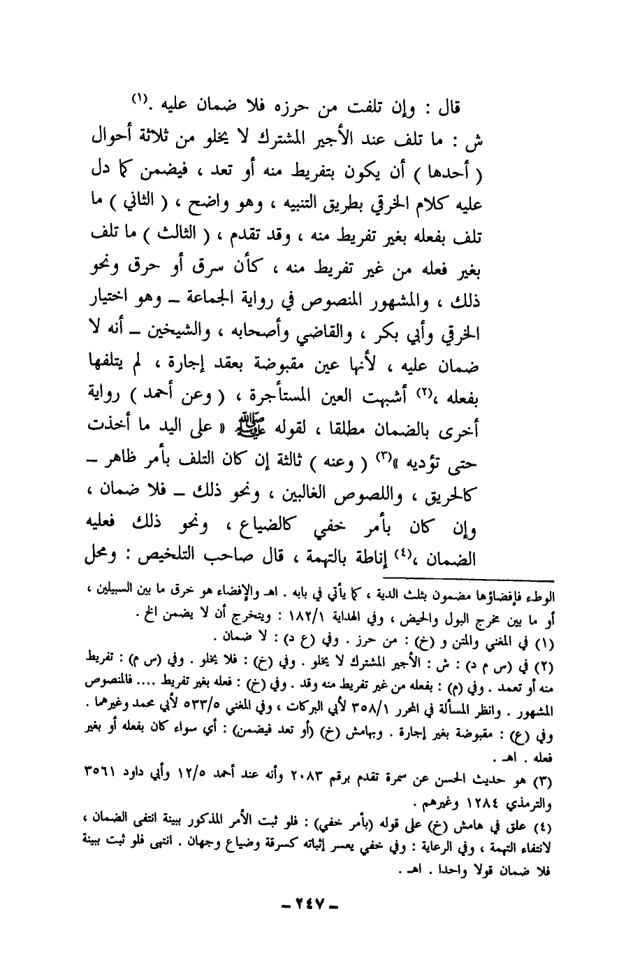 ش: ما تلف عند الأجير المشترك لا يخلو من ثلاثة أحوال: