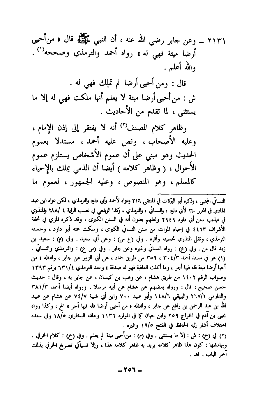 2131 - وعن جابر - رَضِيَ اللَّهُ عَنْهُ -، أن النبي - صَلَّى اللَّهُ عَلَيْهِ وَسَلَّمَ - قال: «من أحيا أرضا ميتة فهي له» رواه أحمد والترمذي وصححه. والله أعلم.