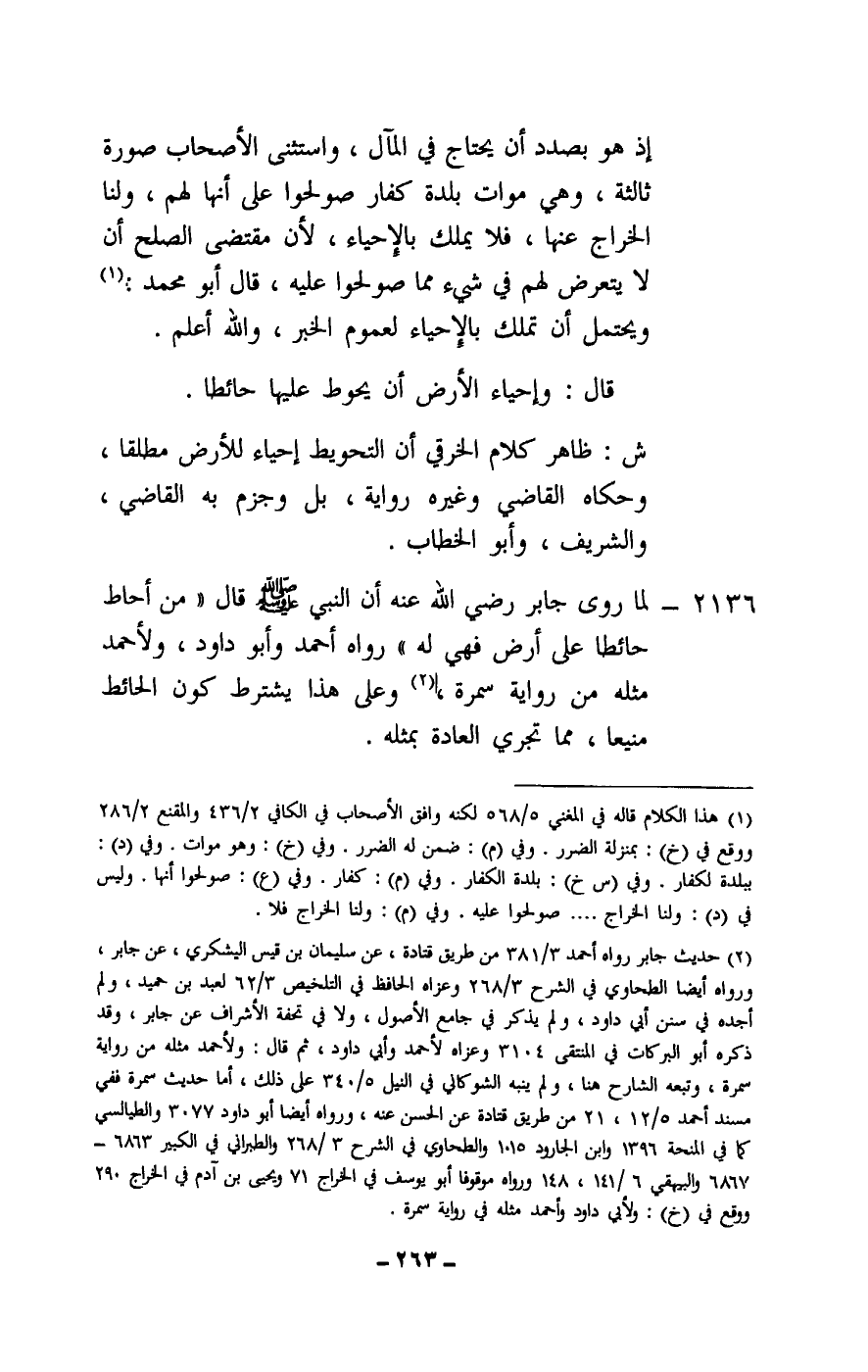 ش: ظاهر كلام الخرقي أن التحويط إحياء للأرض مطلقا، وحكاه القاضي وغيره رواية، بل وجزم به القاضي، والشريف، وأبو الخطاب.