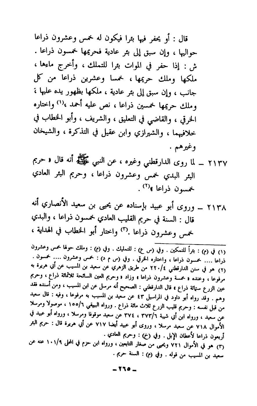 2138 - وروى أبو عبيد بإسناده عن يحيى بن سعيد الأنصاري أنه قال: السنة في حريم القليب العادي خمسون ذراعا، والبدي خمس وعشرون ذراعا. واختار أبو الخطاب في الهداية،