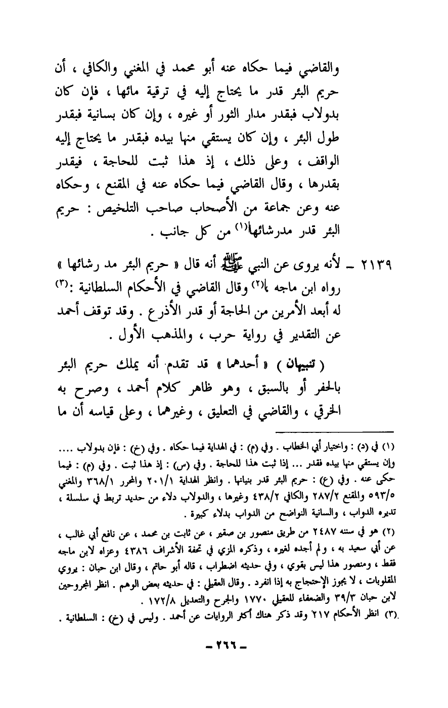2139 - لأنه يروى عن النبي - صَلَّى اللَّهُ عَلَيْهِ وَسَلَّمَ - أنه قال: «حريم البئر مد رشائها» رواه ابن ماجه، وقال القاضي في الأحكام السلطانية: له أبعد الأمرين من الحاجة أو قدر الأذرع. وقد توقف أحمد عن التقدير في رواية حرب، والمذهب الأول.