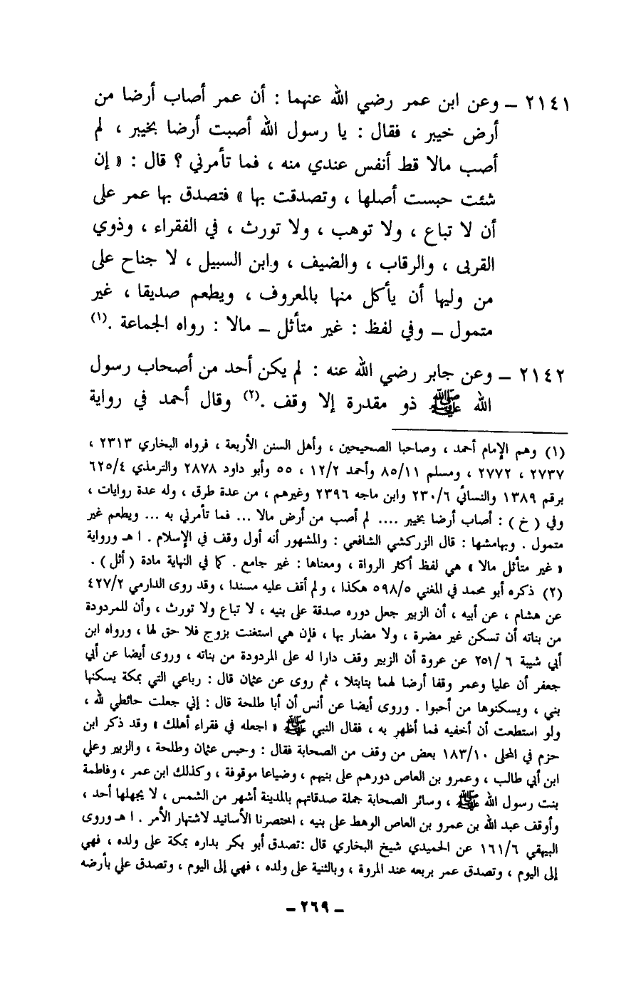 2141 - وعن ابن عمر - رَضِيَ اللَّهُ عَنْهُمَا -: «أن عمر أصاب أرضا من أرض خيبر، فقال: يا رسول الله أصبت أرضا بخيبر، لم أصب مالا قط أنفس عندي منه، فما تأمرني؟ قال: «إن شئت حبست أصلها، وتصدقت بها» فتصدق بها عمر على أن لا تباع، ولا توهب، ولا تورث، في الفقراء، وذوي القربى، والرقاب، والضيف، وابن السبيل، لا جناح على من وليها أن يأكل منها بالمعروف، ويطعم صديقا، غير متمول - وفي لفظ: غير متأثل - مالا» : رواه الجماعة.