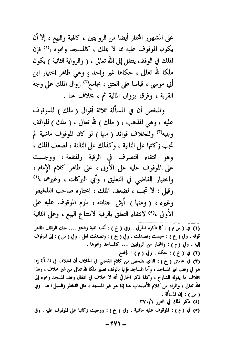 وتلخص أن في المسألة ثلاثة أقوال: (ملك) للموقوف عليه، وهي المذهب، (ملك) لله تعالى، (ملك) للواقف وبنيه، وللخلاف فوائد: (منها) لو كان الموقوف ماشية لم تجب زكاتها على الثانية، وكذلك على الثالثة، لضعف الملك، وهو انتقاء التصرف في الرقبة والمنفعة، ووجبت على الموقوف عليه على الأولى، على ظاهر كلام الإمام، واختيار القاضي في التعليق، وأبي البركات، وغيرهما، وقيل: لا تجب، لضعف الملك، اختاره صاحب التلخيص وغيره، (ومنها) : أرش جنايته، يلزم الموقوف عليه على الأولى، لانتفاء التعلق بالرقبة لامتناع البيع، وعلى الثانية
