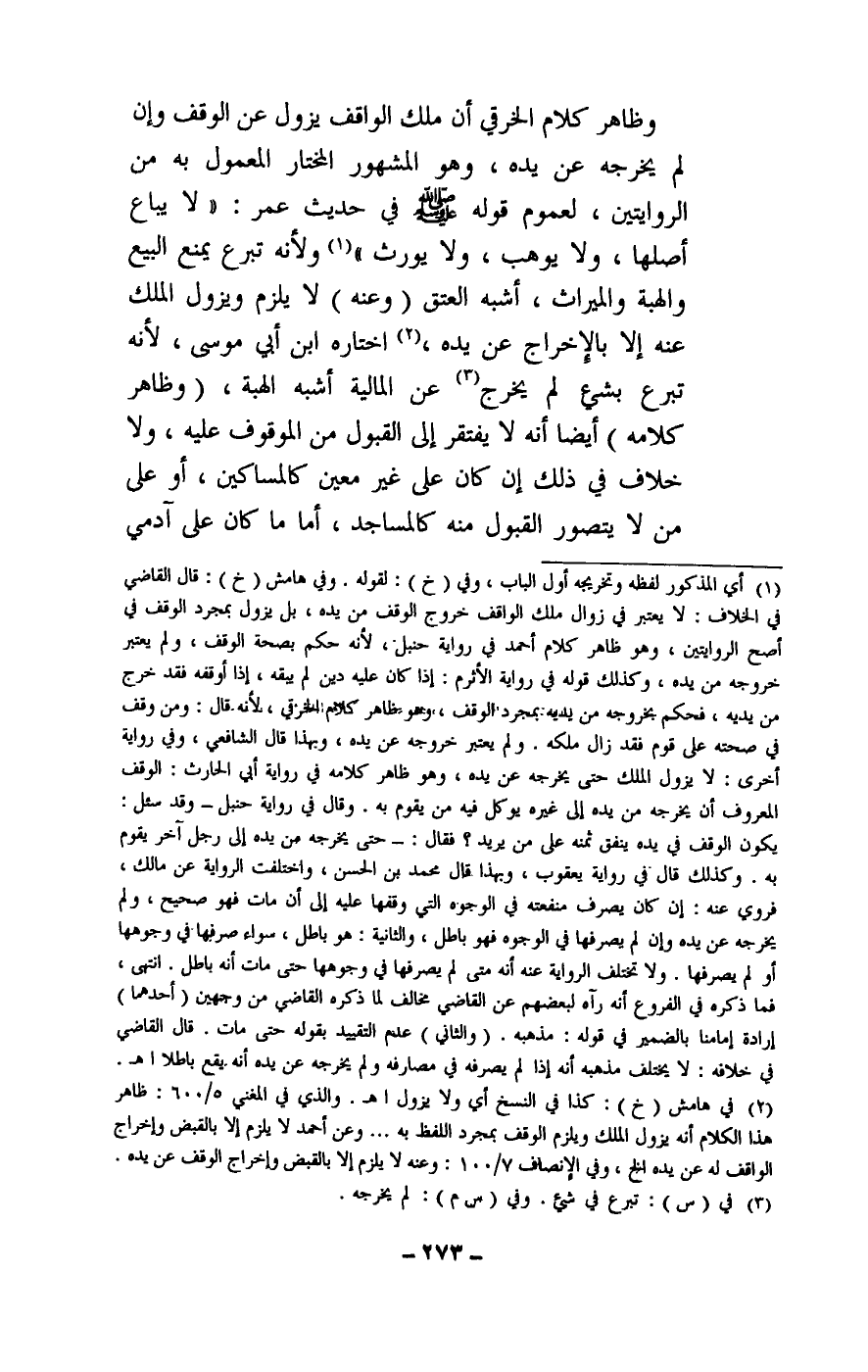 وظاهر كلام الخرقي أن ملك الواقف يزول عن الوقف وإن لم يخرجه عن يده، وهو المشهور المختار المعمول به من الروايتين، لعموم قوله – - صَلَّى اللَّهُ عَلَيْهِ وَسَلَّمَ - في حديث عمر: «لا يباع أصلها، ولا يوهب، ولا يورث» ولأنه تبرع يمنع البيع والهبة والميراث، أشبه العتق (وعنه) لا يلزم ويزول الملك عنه إلا بالإخراج عن يده، اختاره ابن أبي موسى؛ لأنه تبرع بشيء لم يخرج عن المالية أشبه الهبة، (وظاهر كلامه) أيضا أنه لا يفتقر إلى القبول من الموقوف عليه، ولا خلاف في ذلك إن كان على غير معين كالمساكين، أو على من لا يتصور القبول منه كالمساجد، أما ما كان على آدمي