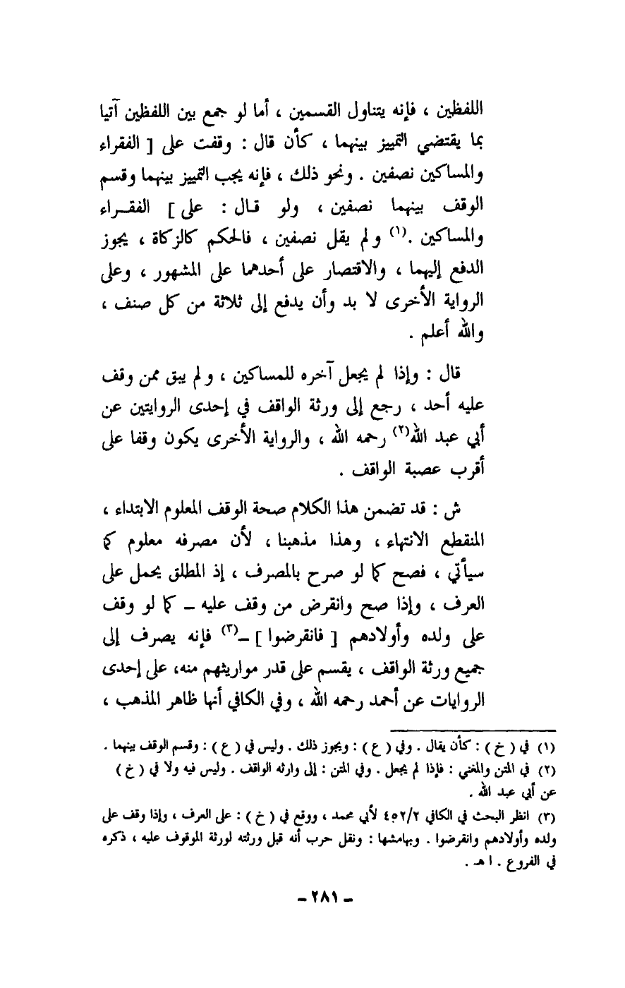 اللفظين، فإنه يتناول القسمين، أما لو جمع بين اللفظين آتيا بما يقتضي التمييز بينهما، كأن قال: وقفت على الفقراء والمساكين نصفين. ونحو ذلك. فإنه يجب التمييز بينهما وقسم الوقف بينهما نصفين، ولو قال: على] الفقراء والمساكين. ولم يقل نصفين، فالحكم كالزكاة، يجوز الدفع إليهما، والاقتصار على أحدهما على المشهور، وعلى الرواية الأخرى لا بد وأن يدفع إلى ثلاثة من كل صنف، والله أعلم.