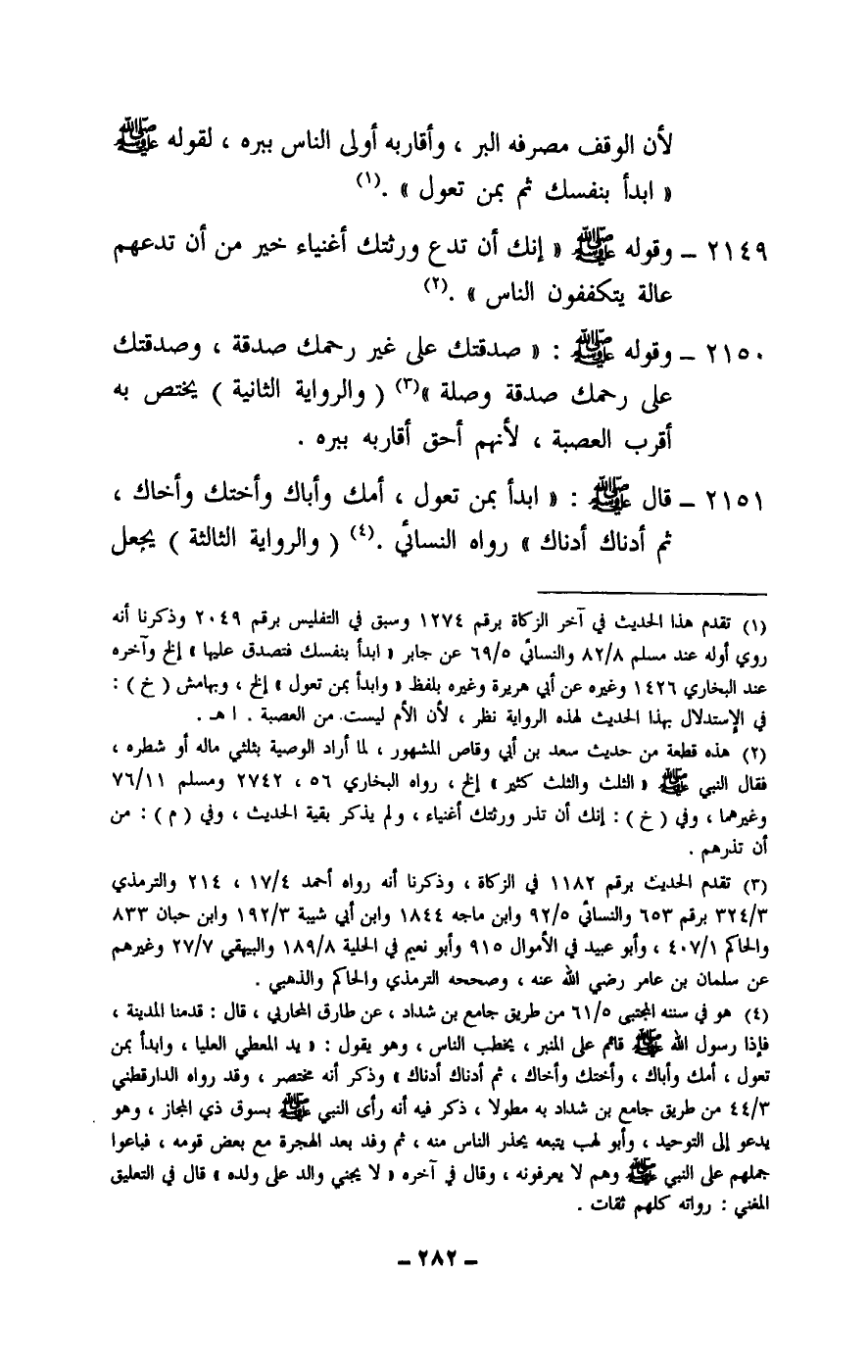 2150 - وقوله: - صَلَّى اللَّهُ عَلَيْهِ وَسَلَّمَ - «صدقتك على غير رحمك صدقة، وصدقتك على رحمك صدقة وصلة» (والراوية الثانية) يختص به أقرب العصبة، لأنهم أحق أقاربه ببره.