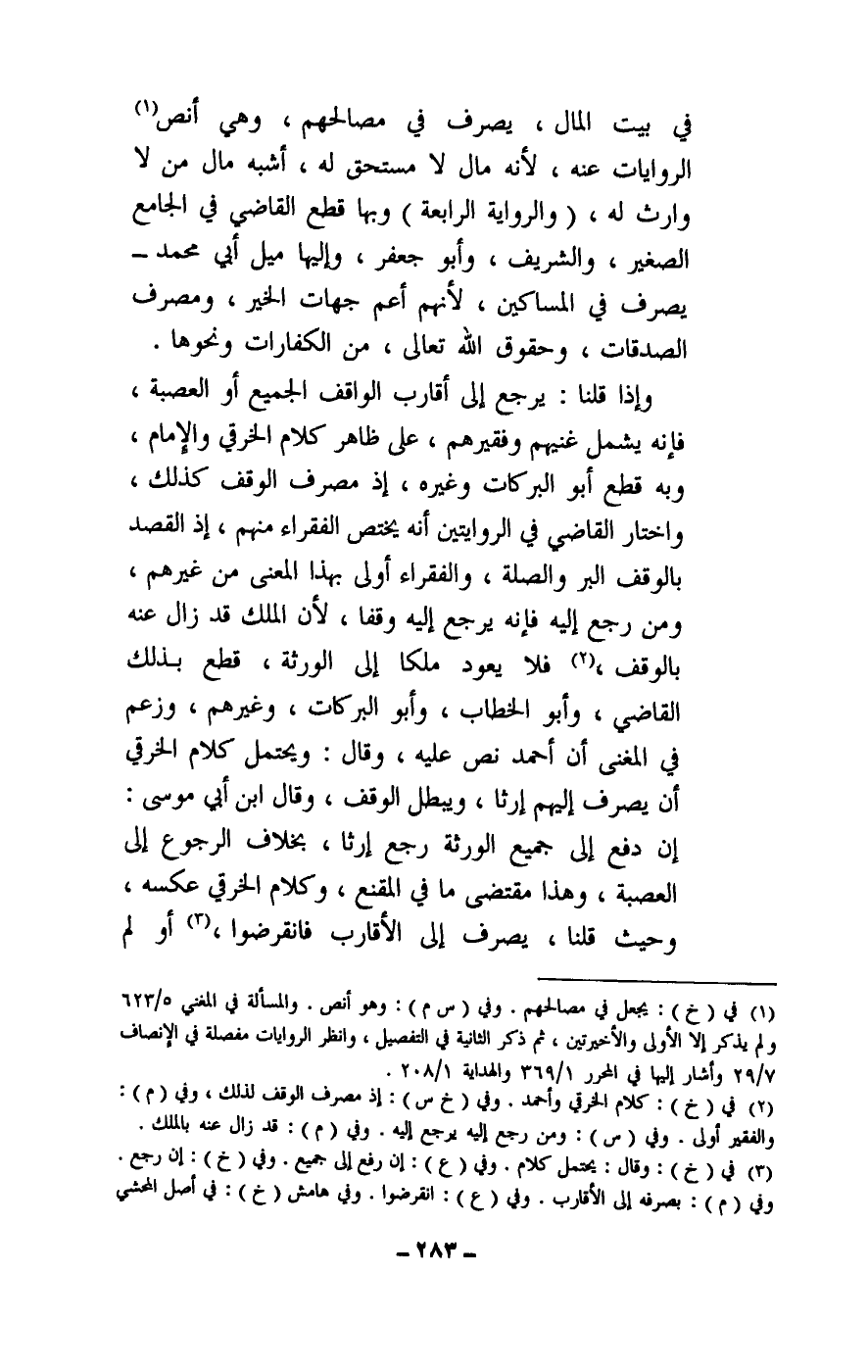 وإذا قلنا: يرجع إلى أقارب الواقف الجميع أو العصبة، فإنه يشمل غنيهم وفقيرهم، على ظاهر كلام الخرقي والإمام، وبه قطع أبو البركات وغيره، إذ مصرف الوقف كذلك، واختار القاضي في الروايتين أنه يختص الفقراء منهم، إذ القصد بالوقف البر والصلة، والفقراء أولى بهذا المعنى من غيرهم، ومن رجع إليه فإنه يرجع إليه وقفا، لأن الملك قد زال عنه بالوقف، فلا يعود، ملكا إلى الورثة، قطع بذلك القاضي، وأبو الخطاب، وأبو البركات، وغيرهم، وزعم في المغني أن أحمد نص عليه، وقال: ويحتمل كلام الخرقي أن يصرف إليهم إرثا، ويبطل الوقف، وقال ابن أبي موسى: إن دفع إلى جميع الورثة رجع إرثا، بخلاف الرجوع إلى العصبة، وهذا مقتضى ما في المقنع، وكلام الخرقي عكسه، وحيث قلنا، يصرف إلى الأقارب فانقرضوا، أو لم