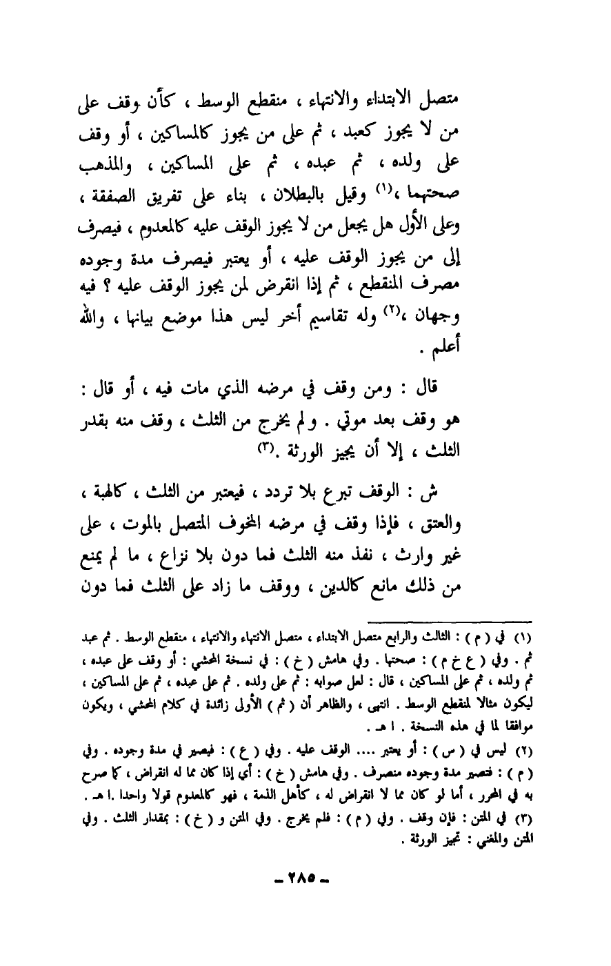 متصل الابتداء والانتهاء، منقطع الوسط، كأن وقف على من لا يجوز كعبد، ثم على من يجوز كالمساكين، أو وقف على ولده، ثم عبده، ثم على المساكين، والمذهب صحتهما، وقيل بالبطلان، بناء على تفريق الصفقة، وعلى الأول هل يجعل من لا يجوز الوقف عليه كالمعدوم، فيصرف إلى من يجوز الوقف عليه، أو يعتبر فيصرف مدة وجوده مصرف المنقطع، ثم إذا انقرض لمن يجوز الوقف عليه؟ فيه وجهان، وله تقاسيم أخر ليس هذا موضع بيانها، والله أعلم.