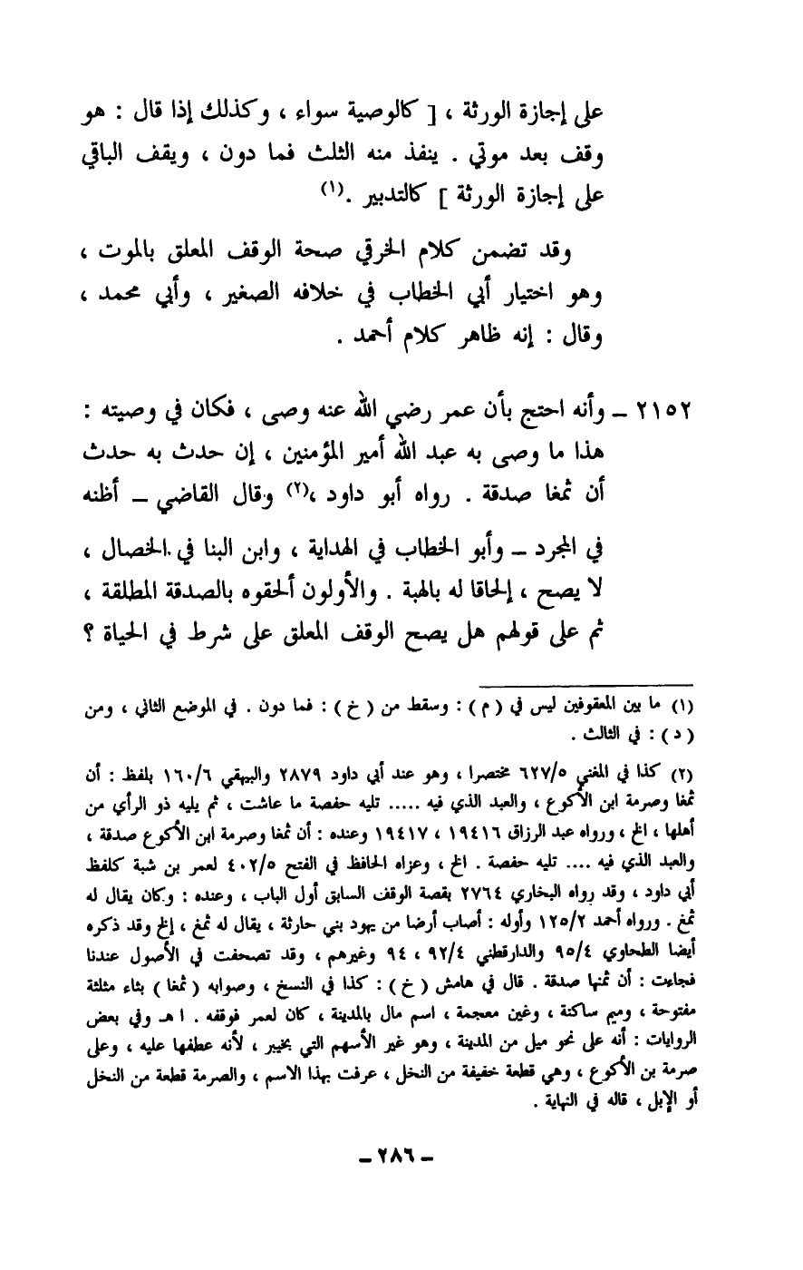 2152 - وأنه احتج بأن عمر - رَضِيَ اللَّهُ عَنْهُ - وصى، فكان في وصيته: هذا ما وصى به عبد الله أمير المؤمنين، إن حدث به حدث أن ثمغا صدقة. رواه أبو داود، وقال القاضي - أظنه في المجرد - وأبو الخطاب في الهداية، وابن البنا في الخصال، لا يصح، إلحاقا له بالهبة. والأولون ألحقوه بالصدقة المطلقة، ثم على قولهم هل يصح الوقف المعلق على شرط في الحياة؟