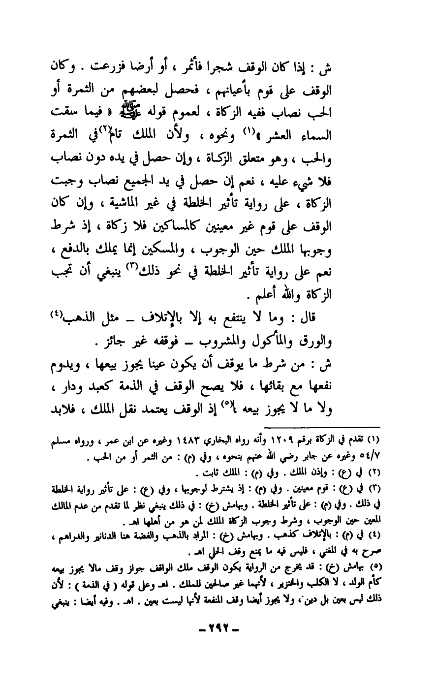 ش: إذا كان الوقف شجرا فأثمر، أو أرضا فزرعت. وكان الوقف على قوم بأعيانهم، فحصل لبعضهم من الثمرة أو الحب نصاب ففيه الزكاة، لعموم قوله: - صَلَّى اللَّهُ عَلَيْهِ وَسَلَّمَ - «فيما سقت السماء العشر» ونحوه، ولأن الملك تام في الثمرة والحب، وهو متعلق الزكاة، وإن حصل في يده دون نصاب فلا شيء عليه، نعم إن حصل في يد الجميع نصاب وجبت الزكاة. على رواية تأثير الخلطة في غير الماشية، وإن كان الوقف على قوم غير معينين كالمساكين فلا زكاة، إذ شرط وجوبها الملك حين الوجوب، والمسكين إنما يملك بالدفع، نعم على رواية تأثير الخلطة في نحو ذلك ينبغي أن تجب الزكاة والله أعلم.