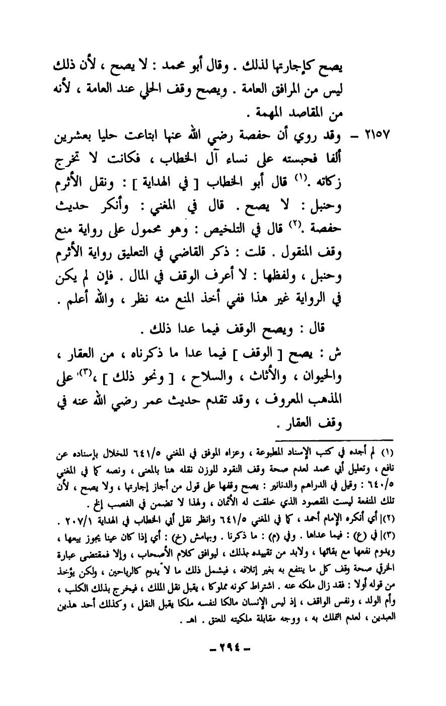 2157 - وقد روي أن حفصة - رَضِيَ اللَّهُ عَنْهَا - ابتاعت حليا بعشرين ألفا فحبسته على نساء آل الخطاب، فكانت لا تخرج زكاته. قال أبو الخطاب [في الهداية] : ونقل الأثرم وحنبل: لا يصح. قال في المغني: وأنكر حديث حفصة. قال في التلخيص: وهو محمول على رواية منع وقف المنقول. قلت: ذكر القاضي في التعليق رواية الأثرم وحنبل، ولفظها: لا أعرف الوقف في المال. فإن لم يكن في الرواية غير هذا ففي أخذ المنع منه نظر، والله أعلم.