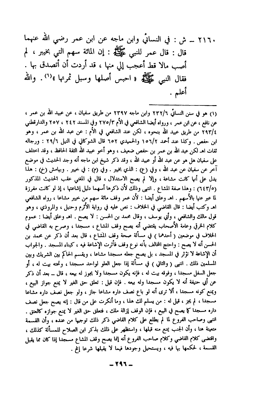 2160 - ش: في النسائي وابن ماجه عن ابن عمر - رَضِيَ اللَّهُ عَنْهُمَا - قال: «قال عمر للنبي - صَلَّى اللَّهُ عَلَيْهِ وَسَلَّمَ -: إن المائة سهم التي بخيبر، لم أصب مالا قط أعجب إلي منها، قد أردت أن أتصدق بها. فقال النبي - صَلَّى اللَّهُ عَلَيْهِ وَسَلَّمَ -: احبس أصلها وسبل ثمرتها» . والله أعلم.