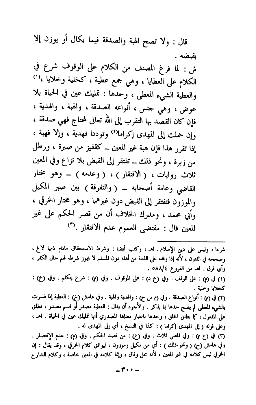 ش: لما فرغ المصنف من الكلام على الوقوف شرع في الكلام على العطايا، وهي جمع عطية، كخلية وخلايا، والعطية الشيء المعطى، وحدها: تمليك عين في الحياة بلا عوض، وهي جنس، أنواعه الصدقة، والهبة، والهدية، فإن كان القصد بها التقرب إلى الله تعالى لمحتاج فهي صدقة، وإن حملت إلى المهدى إكراما وتوددا فهدية، وإلا فهبة، إذا تقرر هذا فإن هبة غير المعين - كقفيز من صبرة، ورطل من زبرة، ونحو ذلك - تفتقر إلى القبض بلا نزاع وفي المعين ثلاث روايات، (الافتقار) ، (وعدمه) - وهو مختار القاضي وعامة أصحابه - (والتفرقة) بين صبر المكيل والموزون فتفتقر إلى القبض دون غيرهما، وهو مختار الخرقي، وأبي محمد، ومدرك الخلاف أن من قصر الحكم على غير المعين قال: مقتضى العموم عدم الافتقار.