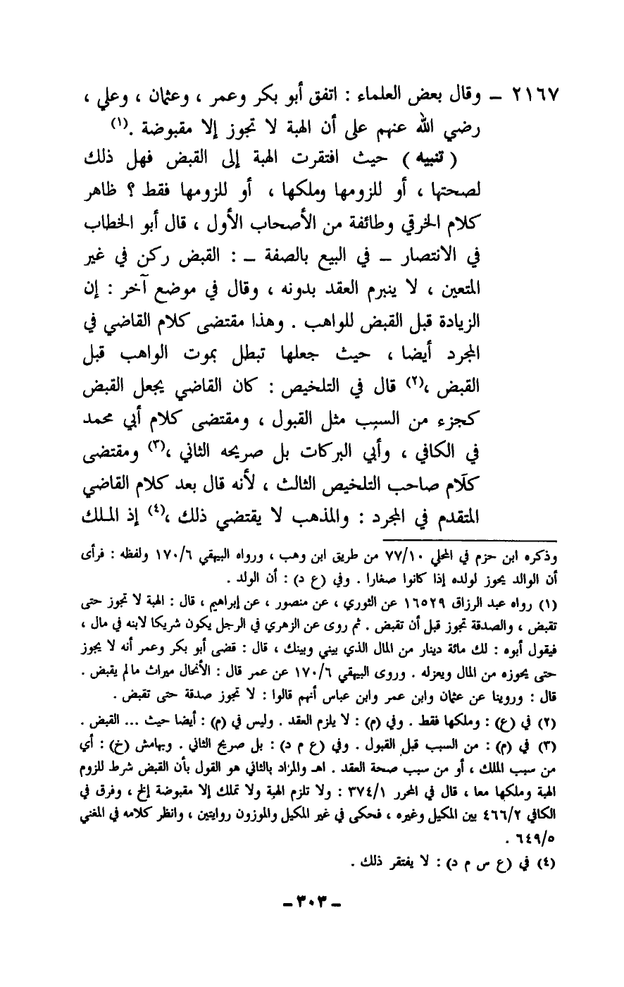 2167 - وقال بعض العلماء: اتفق أبو بكر وعمر، وعثمان، وعلي، - رَضِيَ اللَّهُ عَنْهُمْ - على أن الهبة لا تجوز إلا مقبوضة.