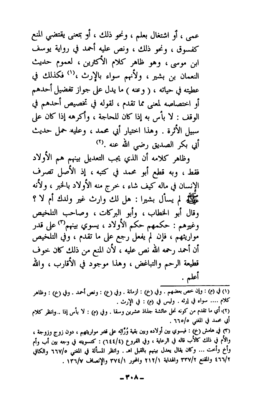 عمى، أو اشتغال بعلم، ونحو ذلك، أو بمعنى يقتضي المنع كفسوق، ونحو ذلك، ونص عليه أحمد في رواية يوسف ابن موسى، وهو ظاهر كلام الأكثرين؛ لعموم حديث النعمان بن بشير، ولأنهم سواء بالإرث، فكذلك في عطيته في حياته، (وعنه) ما يدل على جواز تفضيل أحدهم أو اختصاصه لمعنى مما تقدم، لقوله في تخصيص أحدهم في الوقف: لا بأس به إذا كان للحاجة، وأكرهه إذا كان على سبيل الأثرة. وهذا اختيار أبي محمد، وعليه حمل حديث أبي بكر الصديق - رَضِيَ اللَّهُ عَنْهُ -.