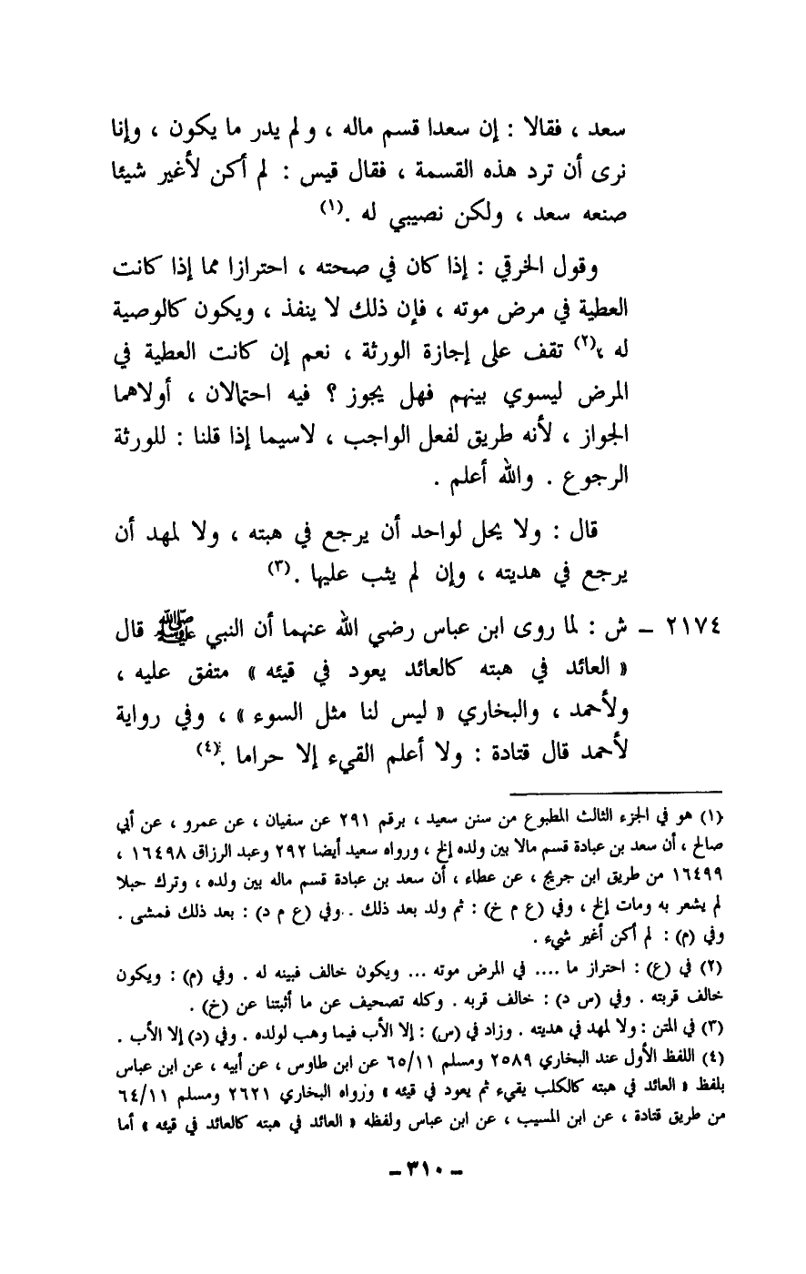 2174 - ش: لما روى ابن عباس - رَضِيَ اللَّهُ عَنْهُمَا - أن النبي - صَلَّى اللَّهُ عَلَيْهِ وَسَلَّمَ - قال: «العائد في هبته كالعائد يعود في قيئه» متفق عليه، ولأحمد، والبخاري ليس لنا مثل السوء، وفي رواية لأحمد قال قتادة: ولا أعلم القيء إلا حراما.