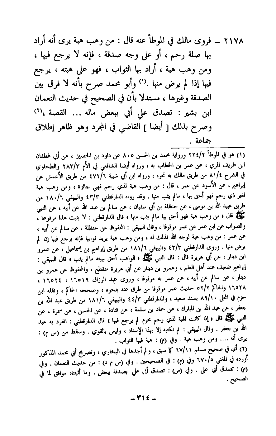 2178 - فروى مالك في الموطأ عنه قال: من وهب هبة يرى أنه أراد بها صلة رحم، أو على وجه صدقة، فإنه لا يرجع فيها، ومن وهب هبة، أراد بها الثواب، فهو على هبته، يرجع فيها إذا لم يرض منها. وأبو محمد صرح بأنه لا فرق بين الصدقة وغيرها، مستدلا بأن في الصحيح في حديث النعمان بن بشير: تصدق علي أبي ببعض ماله. . . القصة، وصرح بذلك [أيضا] القاضي في المجرد وهو ظاهر إطلاق جماعة.