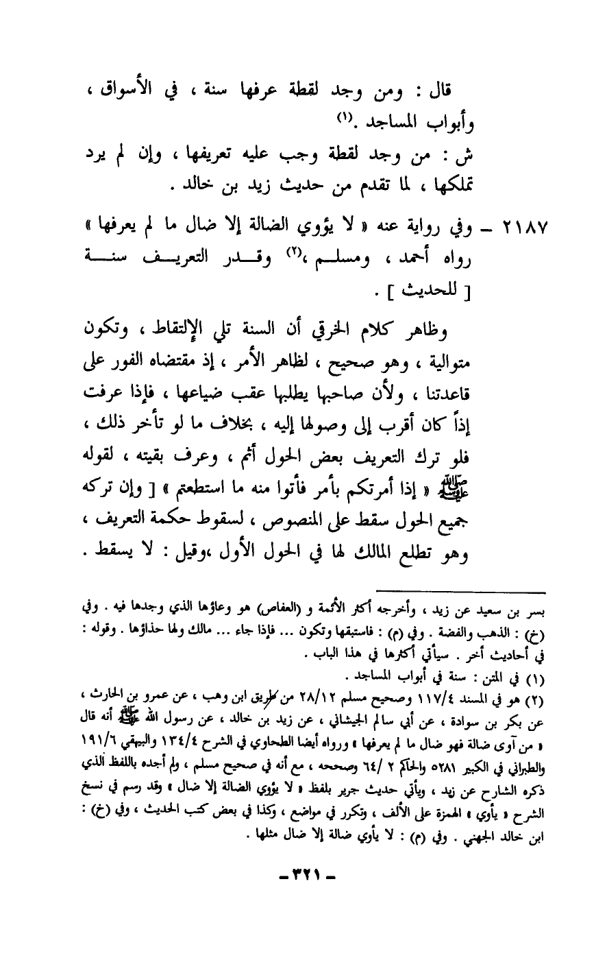 2187 - وفي رواية عنه «لا يؤوي الضالة إلا ضال ما لم يعرفها» رواه أحمد، ومسلم، وقدر التعريف سنة [للحديث] .