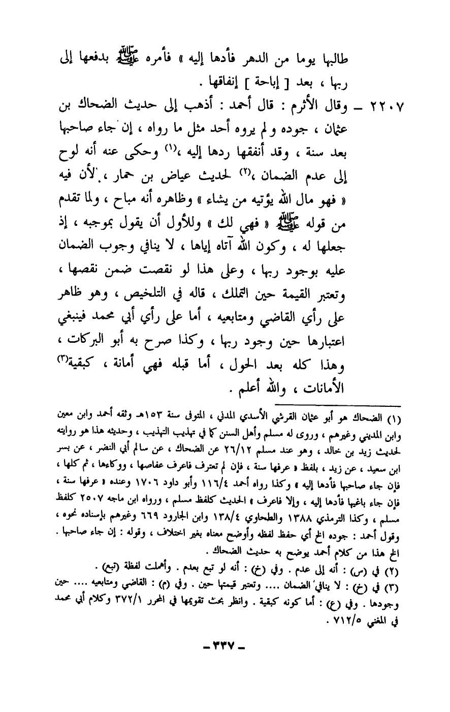 2207 - وقال الأثرم: قال أحمد: أذهب إلى حديث الضحاك بن عثمان، جوده ولم يروه أحد مثل ما رواه، إن جاء صاحبها بعد سنة، وقد أنفقها ردها إليه، وحكى عنه أنه لوح إلى عدم الضمان، لحديث عياض بن حمار، لأن فيه «فهو مال الله يؤتيه من يشاء» وظاهره أنه مباح، ولما تقدم من قوله: - صَلَّى اللَّهُ عَلَيْهِ وَسَلَّمَ - فهي لك وللأول أن يقول بموجبه، إذ جعلها له، وكون الله آتاه إياها، لا ينافي وجوب الضمان عليه بوجود ربها، وعلى هذا لو نقصت ضمن نقصها، وتعتبر القيمة حين التملك، قاله في التلخيص، وهو ظاهر على رأي القاضي ومتابعيه، أما على رأي أبي محمد فينبغي اعتبارها حين وجود ربها، وكذا صرح به أبو البركات، وهذا كله بعد الحول، أما قبله فهي أمانة، كبقية الأمانات، والله أعلم.