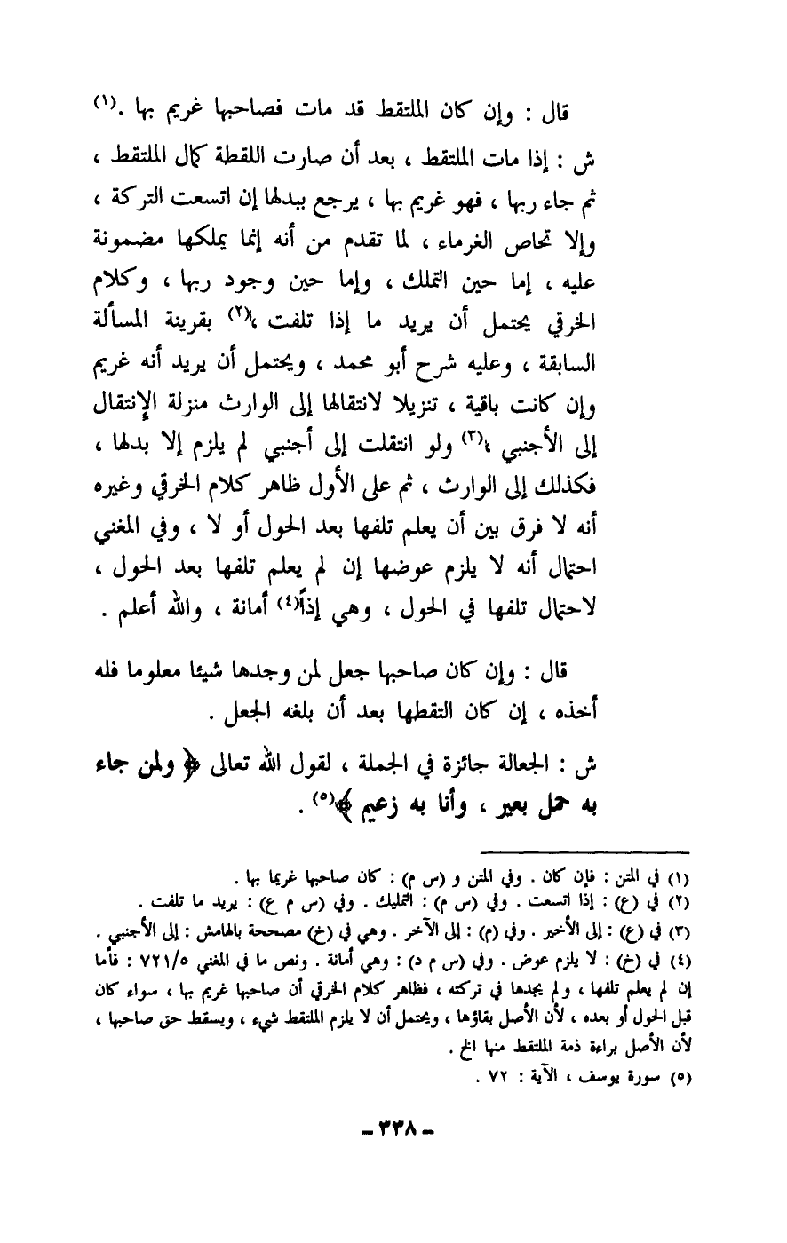 ش: إذا مات الملتقط، بعد أن صارت اللقطة كمال الملتقط، ثم جاء ربها، فهو غريم بها، يرجع ببدلها إن اتسعت التركة، وإلا تحاص الغرماء، لما تقدم من أنه إنما يملكها مضمونة عليه، إما حين التملك، وإما حين وجود ربها، وكلام الخرقي يحتمل أن يريد ما إذا تلفت، بقرينة المسألة السابقة، وعليه شرح أبو محمد، ويحتمل أن يريد أنه غريم وإن كانت باقية، تنزيلا لانتقالها إلى الوارث منزلة الانتقال إلى الأجنبي، ولو انتقلت إلى أجنبي لم يلزم إلا بدلها، فكذلك إلى الوارث، ثم على الأول ظاهر كلام الخرقي وغيره أنه لا فرق بين أن يعلم تلفها بعد الحول أو لا، وفي المغني احتمال أنه لا يلزم عوضها إن لم يعلم تلفها بعد الحول، لاحتمال تلفها في الحول، وهي إذا أمانة، والله أعلم.