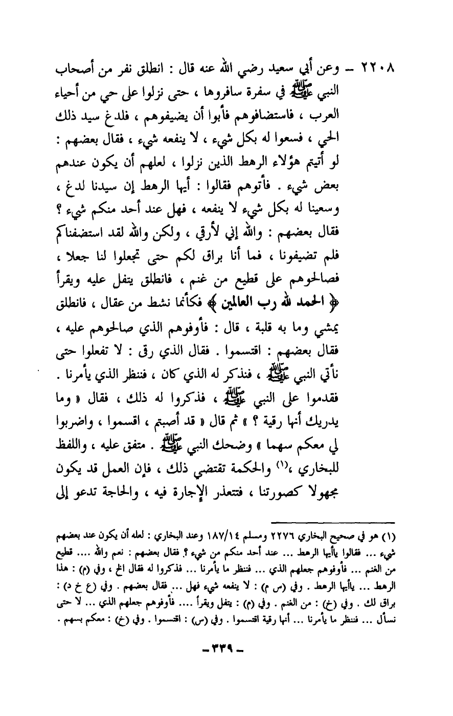 2208 - «وعن أبي سعيد - رَضِيَ اللَّهُ عَنْهُ - قال: انطلق نفر من أصحاب النبي - صَلَّى اللَّهُ عَلَيْهِ وَسَلَّمَ - في سفرة سافروها، حتى نزلوا على حي من أحياء العرب، فاستضافوهم فأبوا أن يضيفوهم، فلدغ سيد ذلك الحي، فسعوا له بكل شيء، لا ينفعه شيء، فقال بعضهم: لو أتيتم هؤلاء الرهط الذين نزلوا، لعلهم أن يكون عندهم بعض شيء. فأتوهم فقالوا: أيها الرهط إن سيدنا لدغ، وسعينا له بكل شيء لا ينفعه، فهل عند أحد منكم شيء؟ فقال بعضهم: والله إني لأرقي، ولكن والله لقد استضفناكم فلم تضيفونا، فما أنا براق لكم حتى تجعلوا لنا جعلا، فصالحوهم على قطيع من غنم، فانطلق يتفل عليه ويقرأ: {الْحَمْدُ لِلَّهِ رَبِّ الْعَالَمِينَ} [الفاتحة: 2] فكأنما نشط من عقال، فانطلق يمشي وما به قلبة، قال: فأوفوهم الذي صالحوهم عليه، فقال بعضهم: اقتسموا. فقال الذي رقى: لا تفعلوا حتى نأتي النبي - صَلَّى اللَّهُ عَلَيْهِ وَسَلَّمَ - فنذكر له الذي كان، فننظر الذي يأمرنا. فقدموا على النبي - صَلَّى اللَّهُ عَلَيْهِ وَسَلَّمَ - فذكروا له ذلك، فقال: «وما يدريك أنها رقية؟» ثم قال: «قد أصبتم، اقسموا، واضربوا لي معكم سهما» وضحك النبي - صَلَّى اللَّهُ عَلَيْهِ وَسَلَّمَ -» -. متفق عليه، واللفظ للبخاري، والحكمة تقتضي ذلك، فإن العمل قد يكون مجهولا كصورتنا، فتتعذر الإجارة فيه، والحاجة تدعو إلى