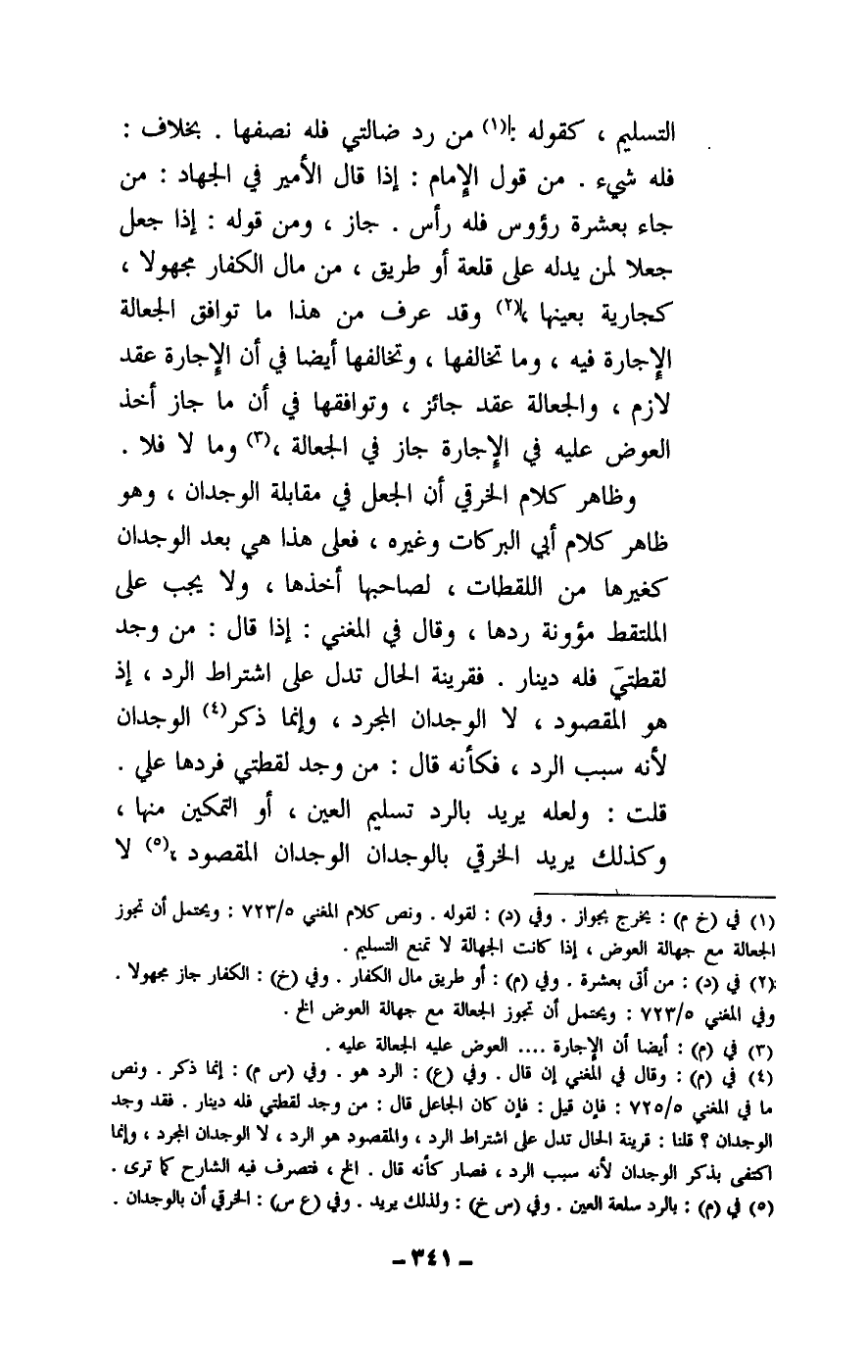 التسليم، كقوله: من رد ضالتي فله نصفها. بخلاف: فله شيء. من قول الإمام: إذا قال الأمير في الجهاد: من جاء بعشرة رؤوس فله رأس. جاز، ومن قوله: إذا جعل جعلا لمن يدله على قلعة أو طريق، من مال الكفار مجهولا، كجارية بعينها، وقد عرف من هذا ما توافق الجعالة الإجارة فيه، وما تخالفها، وتخالفها أيضا في أن الإجارة عقد لازم، والجعالة عقد جائز، وتوافقها في أن ما جاز أخذ العوض عليه في الإجارة جاز في الجعالة، وما لا فلا. وظاهر كلام الخرقي أن الجعل في مقابلة الوجدان، وهو ظاهر كلام أبي البركات وغيره، فعلى هذا هي بعد الوجدان كغيرها من اللقطات، لصاحبها أخذها، ولا يجب على الملتقط مئونة ردها، وقال في المغني: إذا قال: من وجد لقطتي فله دينار. فقرينة الحال تدل على اشتراط الرد، إذ هو المقصود، لا الوجدان المجرد، وإنما ذكر الوجدان لأنه سبب الرد، فكأنه قال: من وجد لقطتي فردها علي. قلت: ولعله يريد بالرد تسليم العين، أو التمكين منها، وكذلك يريد الخرقي بالوجدان الوجدان المقصود، لا
