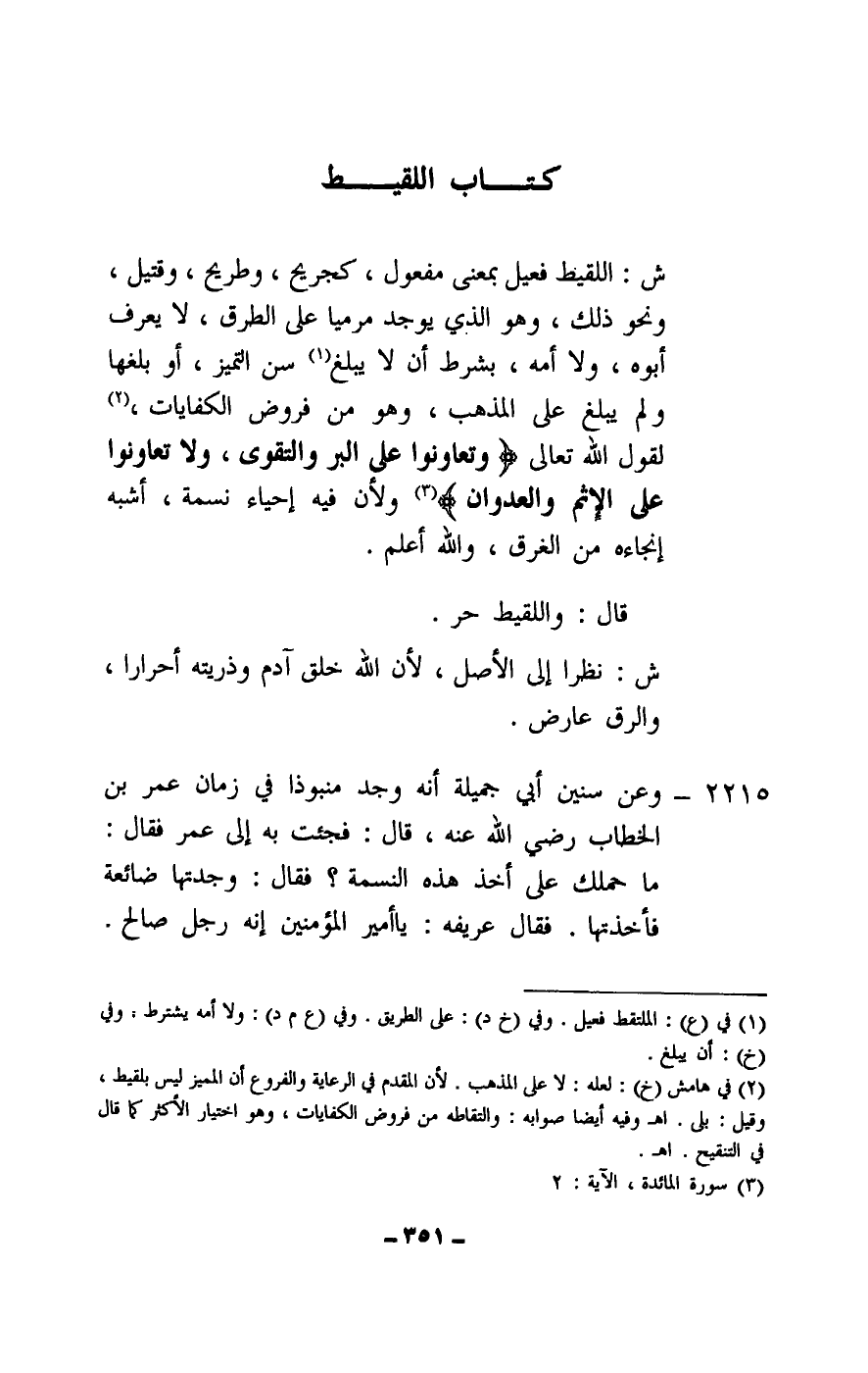 ش: اللقيط فعيل بمعنى مفعول، كجريح، وطريح وقتيل، ونحو ذلك، وهو الذي يوجد مرميا على الطرق، لا يعرف أبوه، ولا أمه، بشرط أن لا يبلغ سن التميز، أو بلغها ولم يبلغ على المذهب، وهو من فروض الكفايات، لقول الله تعالى: {وَتَعَاوَنُوا عَلَى الْبِرِّ وَالتَّقْوَى وَلَا تَعَاوَنُوا عَلَى الْإِثْمِ وَالْعُدْوَانِ} [المائدة: 2] ولأن فيه إحياء نسمة، أشبه إنجاءه من الغرق، والله أعلم.