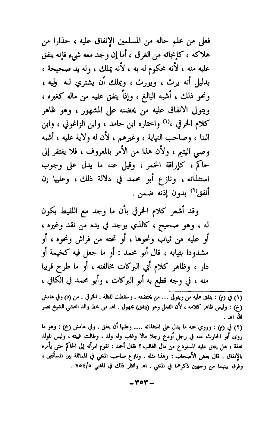 فعلى من علم حاله من المسلمين الإنفاق عليه، حذارا من هلاكه، كإنجائه من الغرق، أما إن وجد معه شيء فإنه ينفق عليه منه؛ لأنه محكوم له به؛ لأنه يملك، وله يد صحيحة، بدليل أنه يرث، ويورث، ويملك أن يشتري له وليه، ونحو ذلك، أشبه البالغ وإذا ينفق عليه من ماله كغيره، ويتولى الإنفاق عليه من يحضنه على المشهور، وهو ظاهر كلام الخرقي، واختاره ابن حامد، وابن الزاغوني، وابن البنا، وصاحب النهاية، وغيرهم، لأن له ولاية عليه، أشبه وصي اليتيم، ولأن هذا من الأمر بالمعروف، فلا يفتقر إلى حاكم، كإراقة الخمر، وقيل عنه ما يدل على وجوب استئذانه، ونازع أبو محمد في دلالة ذلك، وعليها إن أنفق بدون إذنه ضمن. وقد أشعر كلام الخرقي بأن ما وجد مع اللقيط يكون له، وهو صحيح، كالذي يوجد في يده من نقد وغيره، أو عليه من ثياب ونحوها، أو تحته من فراش ونحوه، أو مشدودا بثيابه، قال أبو محمد: أو ما جعل فيه كخيمة أو دار، وظاهر كلام أبي البركات مخالفته، أو ما طرح قريبا منه، في وجه قطع به أبو البركات، وأبو محمد في الكافي،