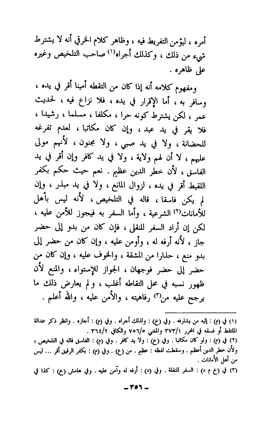 أمره، ليؤمن التفريط فيه، وظاهر كلام الخرقي أنه لا يشترط شيء من ذلك، وكذلك أجراه صاحب التلخيص وغيره على ظاهره.