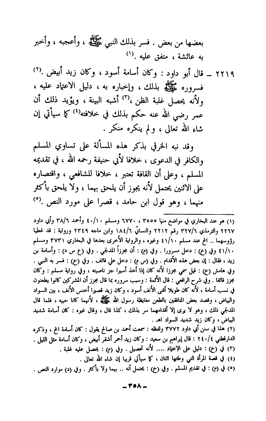 2219 - قال أبو داود: وكان أسامة أسود، وكان زيد أبيض. فسروره - صَلَّى اللَّهُ عَلَيْهِ وَسَلَّمَ - بذلك، وإخباره به، دليل الاعتماد عليه، ولأنه يحصل غلبة الظن، أشبه البينة، ويؤيد ذلك أن عمر - رَضِيَ اللَّهُ عَنْهُ - حكم بذلك في خلافته كما سيأتي إن شاء الله تعالى، ولم ينكره منكر.