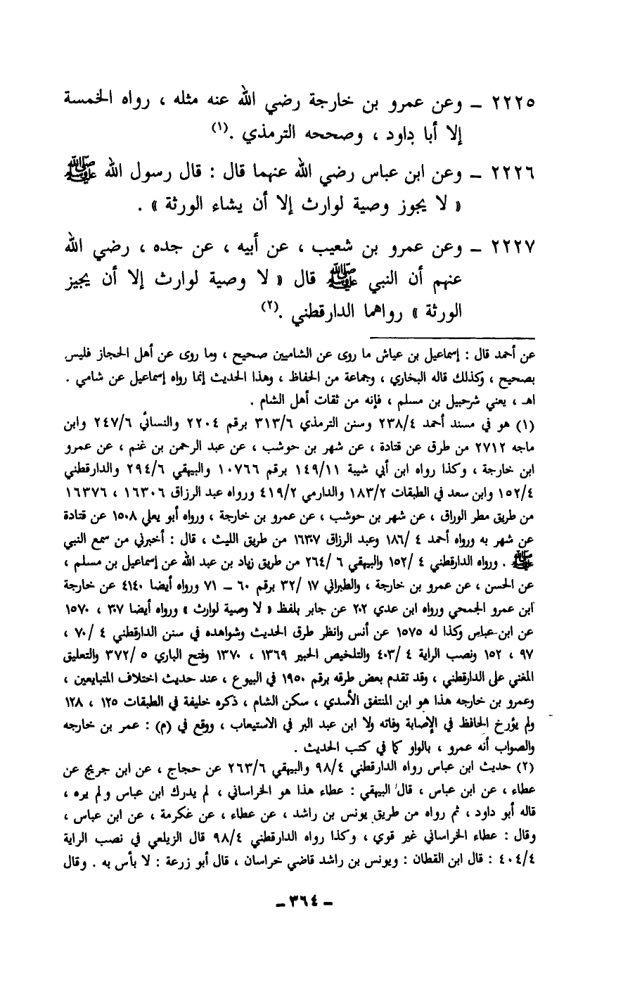 2227 - وعن عمرو بن شعيب، عن أبيه، عن جده، - رَضِيَ اللَّهُ عَنْهُمْ - أن النبي - صَلَّى اللَّهُ عَلَيْهِ وَسَلَّمَ - قال: «لا وصية لوارث إلا أن يجيز الورثة» رواهما الدارقطني.