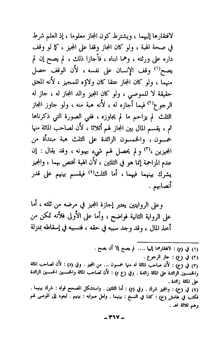لافتقارها إليهما، ويشترط كون المجاز معلوما، إذ العلم شرط في صحة الهبة، ولو كان المجاز وقفا على المجيز، كما لو وقف داره على ورثته، وهما ابناه، فأجازا ذلك، لم يصح إن لم يصح وقف الإنسان على نفسه، لأن الوقف حصل منهما، ولو كان المجاز عتقا كان ولاؤه للمجيز؛ لأنه المعتق حقيقة لا للموصي، ولو كان المجيز والد المجاز له، جاز له الرجوع فيما أجازه له؛ لأنه هبة منه، ولو جاوز المجاز الثلث لم يزاحم ما لم يجاوزه، ففي الصورة التي ذكرناها ثم، يقسم المال بين المجاز لهم أثلاثا، لأن لصاحب المائة منها خمسون، والخمسون الزائدة على الثلث هبة مبتدأة من المجيزين، ولم يحصل لهم شيء يهبونه، وقد يقال: إن عدم المزاحمة إنما هو في الثلثين، لأن الهبة تختص بهما، والمجيز يشرك بينهما فيهما، أما الثلث فيقسم بينهم على قدر أنصابهم.