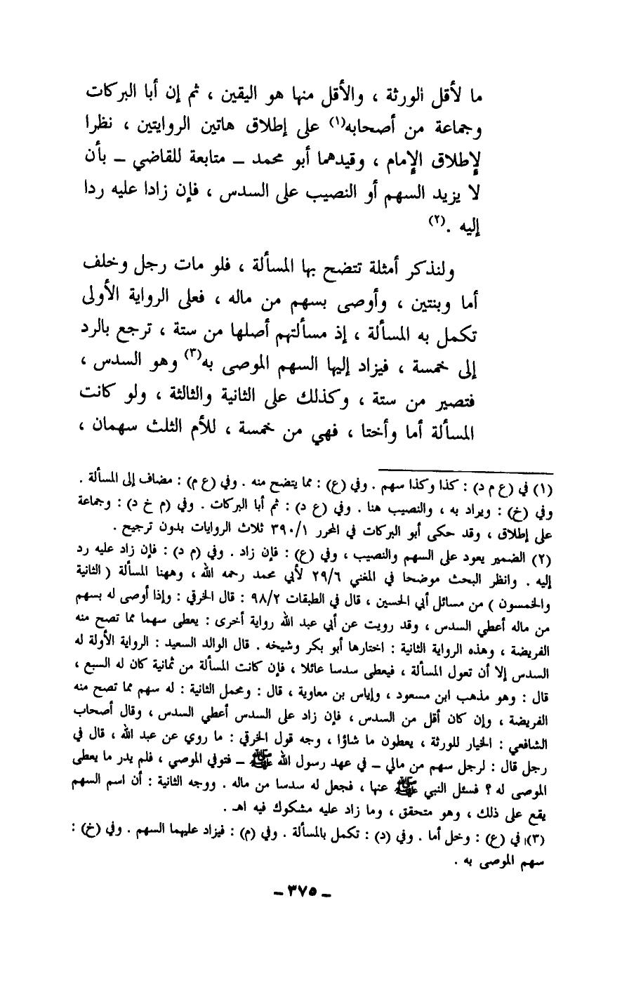 ما لأقل الورثة، والأقل منها هو اليقين، ثم إن أبا البركات وجماعة من أصحابه على إطلاق هاتين الروايتين، نظرا لإطلاق الإمام، وقيدهما أبو محمد - متابعة للقاضي - بأن لا يزيد السهم أو النصيب على السدس، فإن زاد عليه ردا إليه. ولنذكر أمثلة تتضح بها المسألة، فلو مات رجل وخلف أما وبنتين، وأوصى بسهم من ماله، فعلى الرواية الأولى تكمل به المسألة، إذ مسألتهم أصلها من ستة، ترجع بالرد إلى خمسة، فيزاد إليها السهم الموصى به وهو السدس، فتصير من ستة، وكذلك على الثانية والثالثة، ولو كانت المسألة أما وأختا، فهي من خمسة، للأم الثلث سهمان،