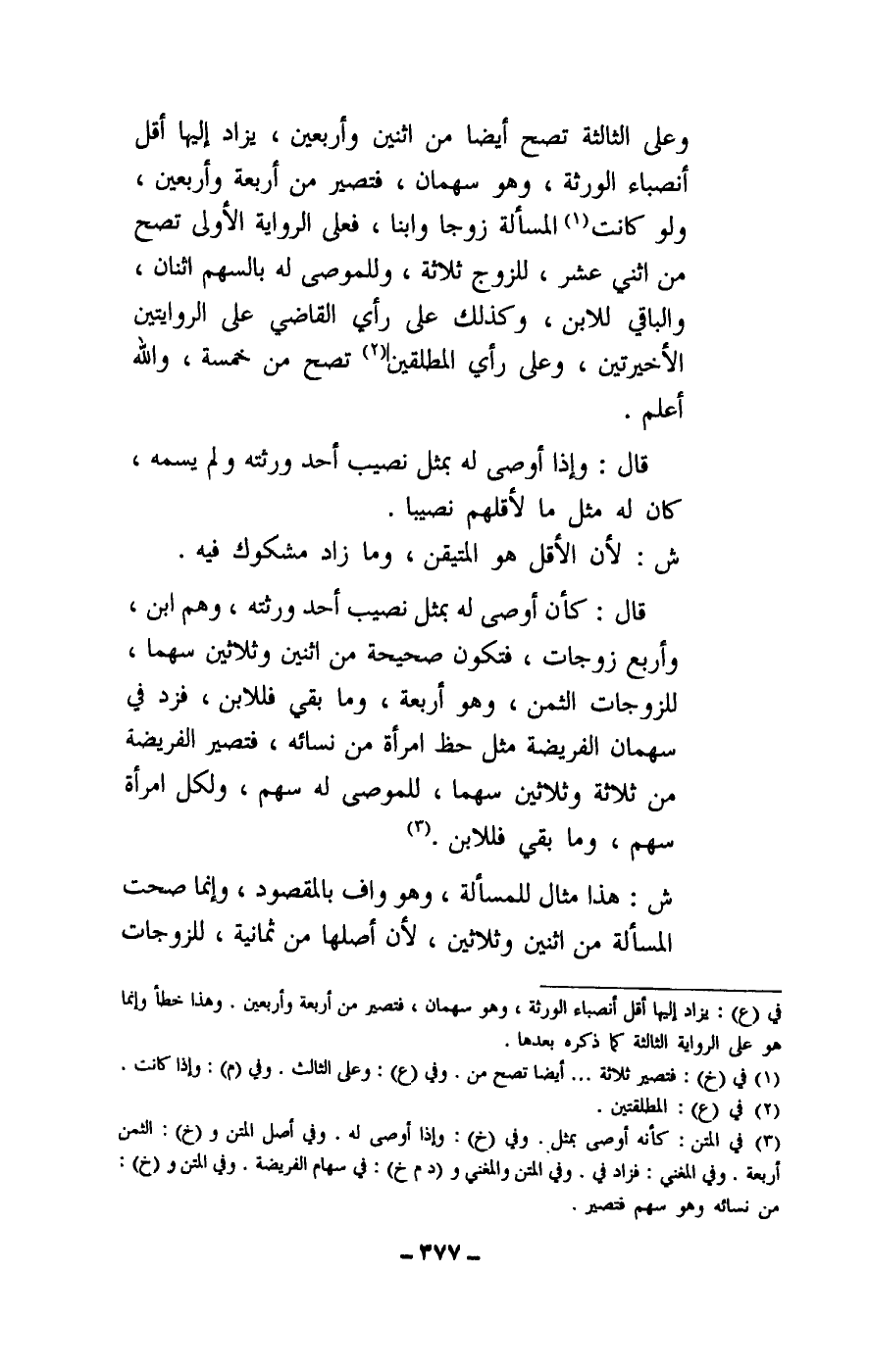 قال: كأن أوصى له بمثل نصيب أحد ورثته، وهم ابن، وأربع زوجات، فتكون صحيحة من اثنين وثلاثين سهما، للزوجات الثمن، وهو أربعة، وما بقي فللابن، فزد في سهمان الفريضة مثل حظ امرأة من نسائه، فتصير الفريضة من ثلاثة وثلاثين سهما، للموصى له سهم، ولكل امرأة سهم، وما بقي فللابن.