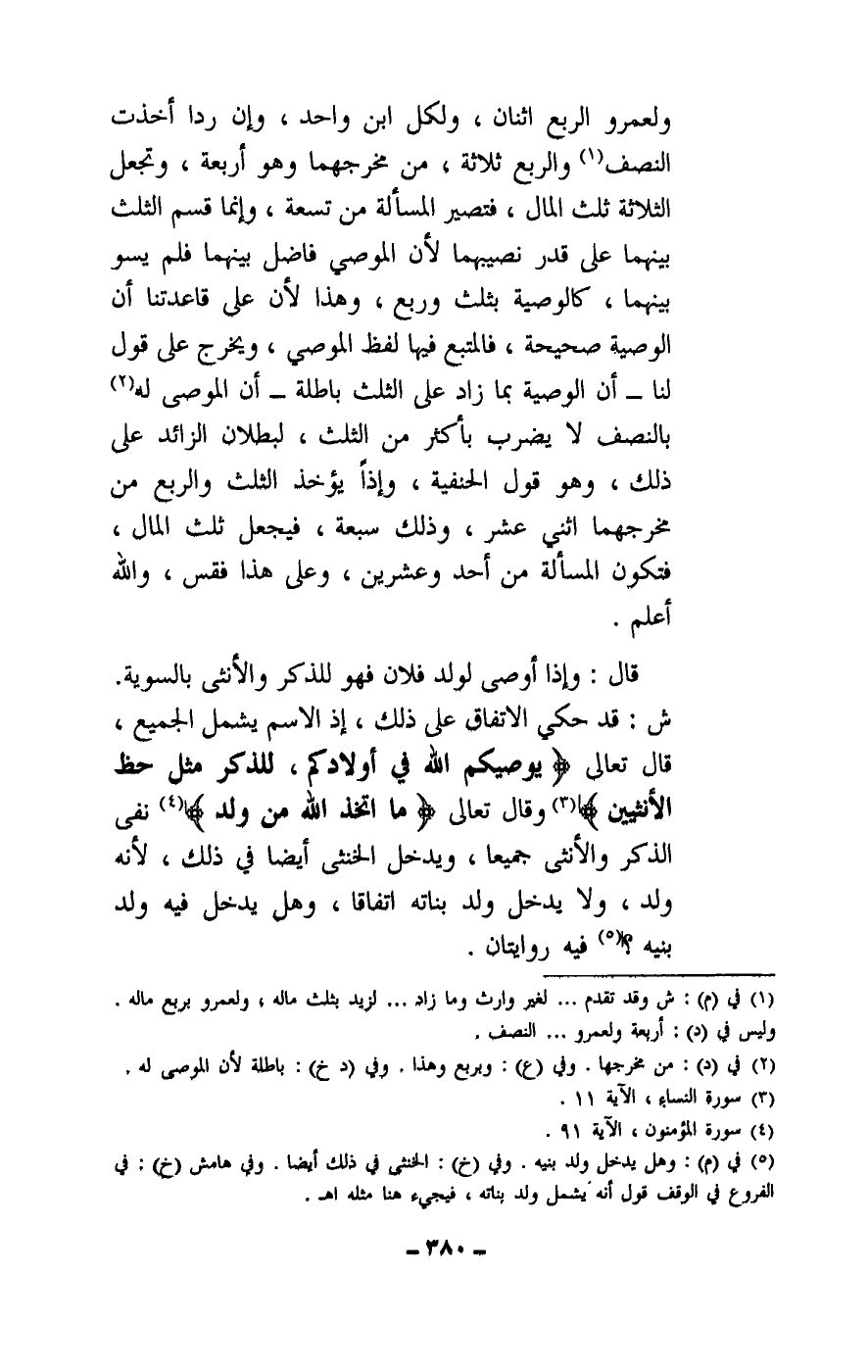 ولعمرو الربع اثنان. ولكل ابن واحد، وإن ردا أخذت النصف والربع ثلاثة، من مخرجهما وهو أربعة، وتجعل الثلاثة ثلث المال، فتصير المسألة من تسعة، وإنما قسم الثلث بينهما على قدر نصيبهما لأن الموصي فاضل بينهما فلم يسو بينهما، كالوصية بثلث وربع، وهذا لأن على قاعدتنا أن الوصية صحيحة، فالمتبع فيها لفظ الموصي، ويخرج على قول لنا - أن الوصية بما زاد على الثلث باطلة - أن الموصى له بالنصف لا يضرب بأكثر من الثلث، لبطلان الزائد على ذلك، وهو قول الحنفية، وإذا يؤخذ الثلث والربع من مخرجهما اثني عشر، وذلك سبعة، فيجعل ثلث المال، فتكون المسألة من أحد وعشرين، وعلى هذا فقس، والله أعلم.