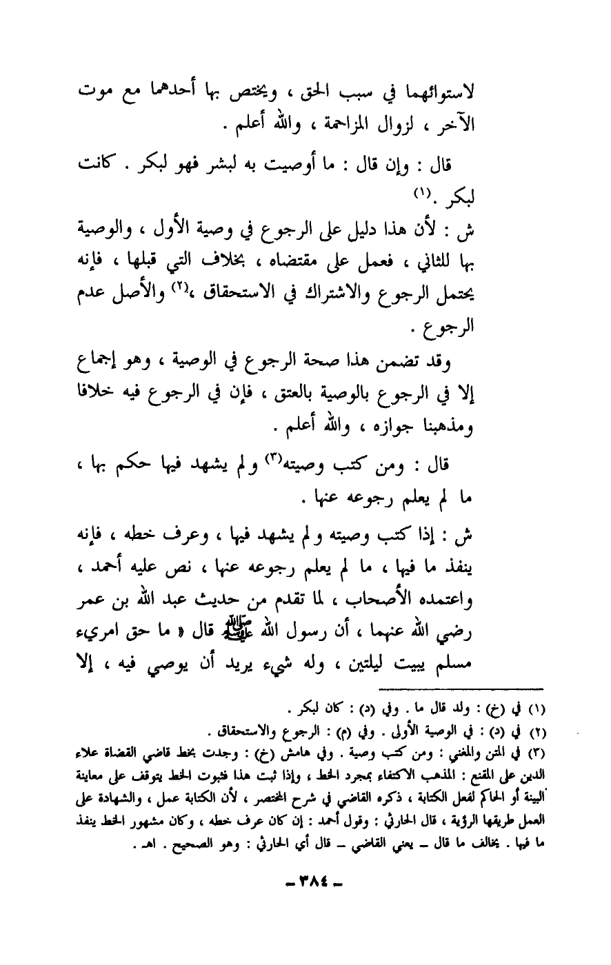 ش: إذا كتب وصيته ولم يشهد فيها، وعرف خطه، فإنه ينفذ ما فيها، ما لم يعلم رجوعه عنها، نص عليه أحمد، واعتمده الأصحاب، لما تقدم من حديث عبد الله بن عمر - رَضِيَ اللَّهُ عَنْهُمَا -، أن رسول الله - صَلَّى اللَّهُ عَلَيْهِ وَسَلَّمَ - قال: «ما حق امرئ مسلم يبيت ليلتين، وله شيء يريد أن يوصي فيه، إلا