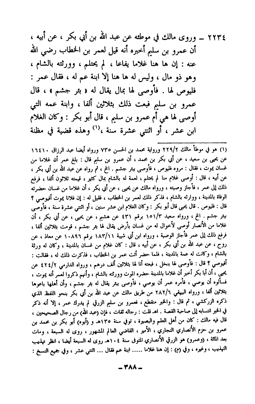 2234 - وروى مالك في موطئه عن عبد الله بن أبي بكر، عن أبيه، أن عمرو بن سليم أخبره أنه قيل لعمر بن الخطاب - رَضِيَ اللَّهُ عَنْهُ -: إن هاهنا غلاما يفاعا، لم يحتلم، وورثته بالشام، وهو ذو مال، وليس له هاهنا إلا ابنة عم له، فقال عمر: فليوص لها. فأوصى لها بمال يقال له: «بئر جشم» ، قال عمرو بن سليم فبعت ذلك بثلاثين ألفا، وابنة عمه التي أوصى هي أم عمرو بن سليم، قال أبو بكر: وكان الغلام ابن عشر، أو اثنتي عشرة سنة، وهذه قضية في مظنة