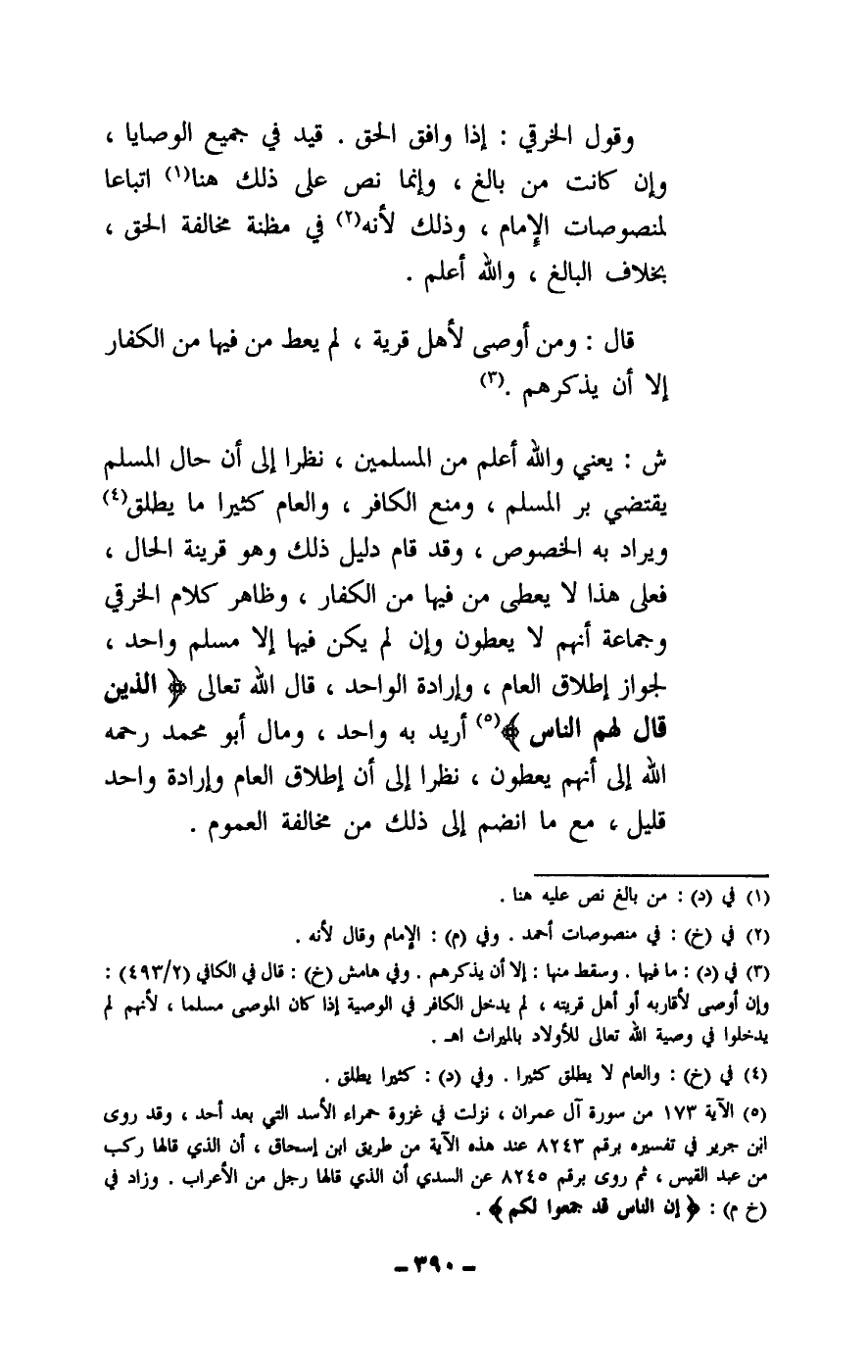 ش: يعني والله أعلم من المسلمين، نظرا إلى أن حال المسلم يقتضي بر المسلم، ومنع الكافر، والعام كثيرا ما يطلق ويراد به الخصوص، وقد قام دليل ذلك وهو قرينة الحال، فعلى هذا لا يعطى من فيها من الكفار، وظاهر كلام الخرقي وجماعة أنهم لا يعطون وإن لم يكن فيها إلا مسلم واحد، لجواز إطلاق العام، وإرادة الواحد، قال الله تعالى: {الَّذِينَ قَالَ لَهُمُ النَّاسُ} [آل عمران: 173] أريد به واحد، ومال أبو محمد - رَحِمَهُ اللَّهُ - إلى أنهم يعطون، نظرا إلى أن إطلاق العام وإرادة واحد قليل، مع ما انضم إلى ذلك من مخالفة العموم.