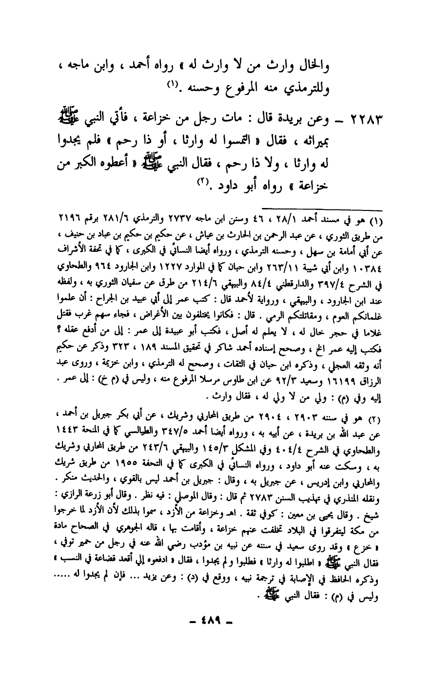 2283 - وعن بريدة قال: «مات رجل من خزاعة، فأتي النبي - صَلَّى اللَّهُ عَلَيْهِ وَسَلَّمَ - بميراثه، فقال: «التمسوا له وارثا، أو ذا رحم» فلم يجدوا له وارثا، ولا ذا رحم، فقال النبي - صَلَّى اللَّهُ عَلَيْهِ وَسَلَّمَ -: «أعطوه الكبر من خزاعة» رواه أبو داود.