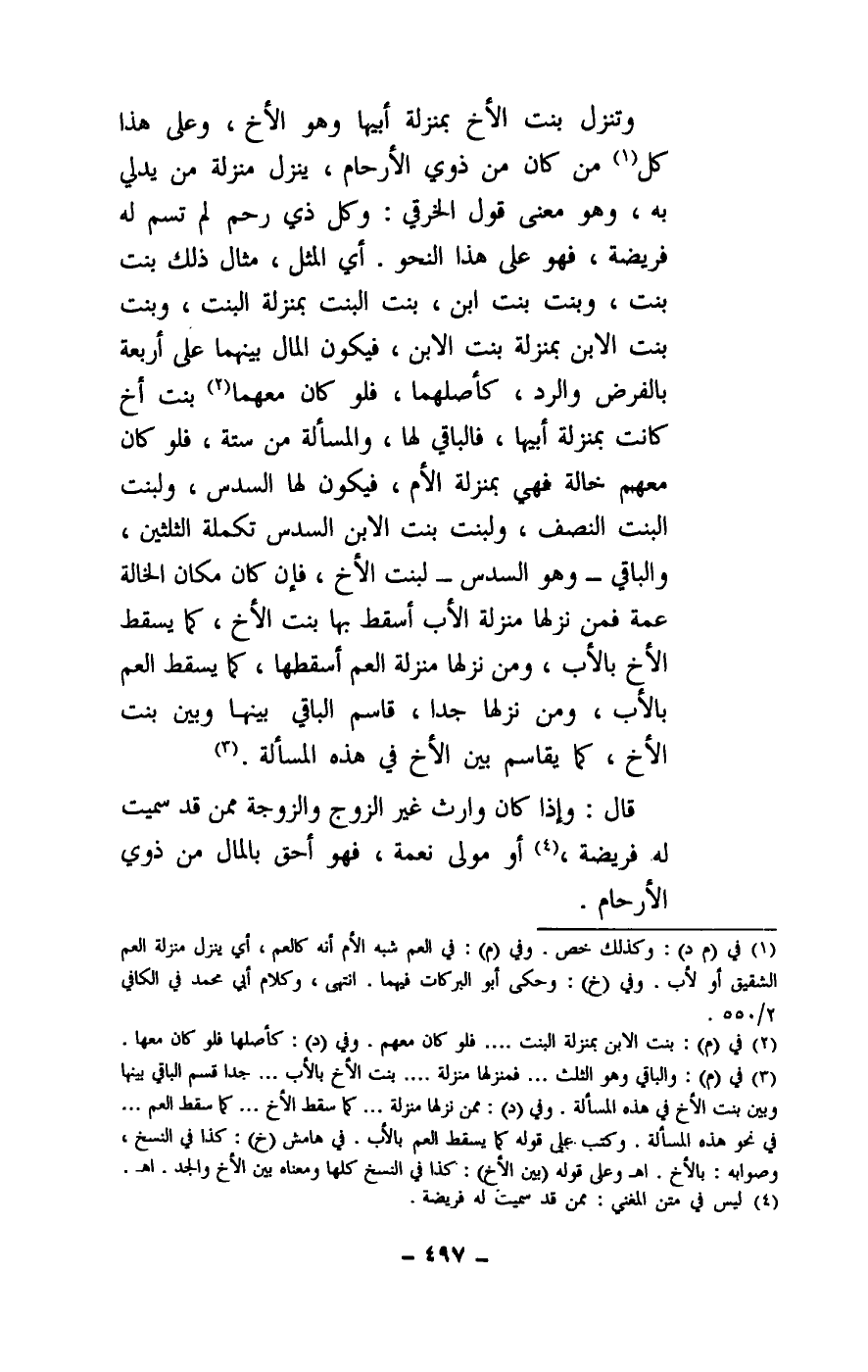 وتنزل بنت الأخ بمنزلة أبيها وهو الأخ، وعلى هذا كل من كان من ذوي الأرحام، ينزل منزلة من يدلي به، وهو معنى قول الخرقي: وكل ذي رحم لم تسم له فريضة، فهو على هذا النحو. أي المثل، مثال ذلك بنت بنت، وبنت بنت ابن، بنت البنت بمنزلة البنت، وبنت بنت الابن بمنزلة بنت الابن، فيكون المال بينهما على أربعة بالفرض والرد، كأصلهما، فلو كان معهما بنت أخ كانت بمنزلة أبيها، فالباقي لها، والمسألة من ستة، فلو كان معهم خالة فهي بمنزلة الأم، فيكون لها السدس، ولبنت البنت النصف، ولبنت بنت الابن السدس تكملة الثلثين، والباقي - وهو السدس - لبنت الأخ، فإن كان مكان الخالة عمة فمن نزلها منزلة الأب أسقط بها بنت الأخ، كما يسقط الأخ بالأب، ومن نزلها منزلة العم أسقطها، كما يسقط العم بالأب، ومن نزلها جدا، قاسم الباقي بينها وبين بنت الأخ، كما يقاسم بين الأخ في هذه المسألة.