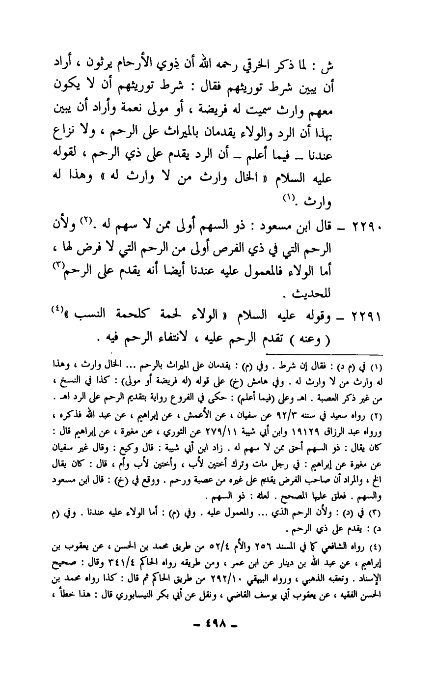 2290 - قال ابن مسعود: ذو السهم أولى ممن لا سهم له. ولأن الرحم التي في ذي الفرض أولى من الرحم التي لا فرض لها، أما الولاء فالمعمول عليه عندنا أيضا أنه يقدم على الرحم للحديث.