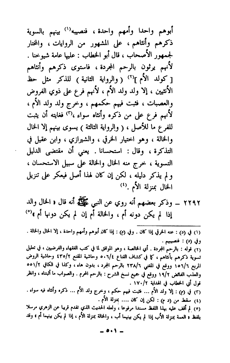 أبوهم واحدا وأمهم واحدة، فنصيبه بينهم بالسوية ذكرهم وأنثاهم، على المشهور من الروايات، والمختار لجمهور الأصحاب، قال أبو الخطاب: عليها عامة شيوخنا. لأنهم يرثون بالرحم المجردة، فاستوى ذكرهم وأنثاهم [كولد الأم] (والرواية الثانية) للذكر مثل حظ الأنثيين، إلا ولد ولد الأم، لأنهم فرع على ذوي الفروض والعصبات، فثبت فيهم حكمهم، وخرج ولد ولد الأم، لأنهم فرع على من ذكره وأنثاه سواء، فغايته أن يثبت للفرع ما للأصل، (والرواية الثالثة) يسوى بينهم إلا الخال والخالة، وهو اختيار الخرقي، والشيرازي، وابن عقيل في التذكرة، وقال: استحسانا. يعني أن مقتضى الدليل التسوية، خرج منه الخال والخالة على سبيل الاستحسان، ولم يذكر دليله، لكن إن كان لهذا أصل فيعكر على تنزيل الخال بمنزلة الأم.