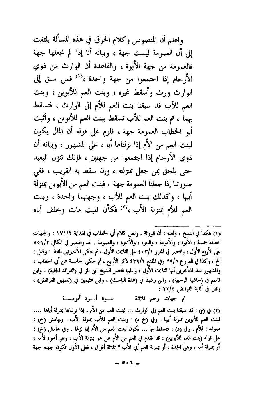واعلم أن المنصوص وكلام الخرقي في هذه المسألة يلتفت إلى أن العمومة ليست جهة، وبيانه أنا إذا لم نجعلها جهة فالعمومة من جهة الأبوة، والقاعدة أن الوارث من ذوي الأرحام إذا اجتمعوا من جهة واحدة، فمن سبق إلى الوارث ورث وأسقط غيره، وبنت العم للأبوين، وبنت العم للأب قد سبقتا بنت العم للأم إلى الوارث، فتسقط بهما، ثم بنت العم للأب تسقط ببنت العم للأبوين، وأثبت أبو الخطاب العمومة جهة، فلزم على قوله أن المال يكون لبنت العم من الأم إذا نزلناها أبا، على المشهور، وبيانه أن ذوي الأرحام إذا اجتمعوا من جهتين، فإنك تنزل البعيد حتى يلحق بمن جعل بمنزلته، وإن سقط به القريب، ففي صورتنا إذا جعلنا العمومة جهة، فبنت العم من الأبوين بمنزلة أبيها، وكذلك بنت العم للأب، وجهتهما واحدة، وبنت العم للأم بمنزلة الأب، فكأن الميت مات وخلف أباه
