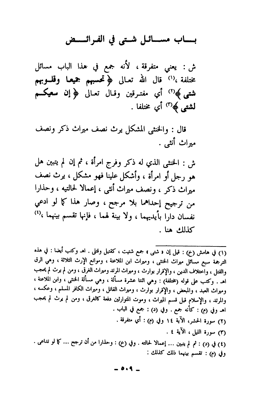 ش: يعني متفرقة، لأنه جمع في هذا الباب مسائل مختلفة، قال الله تعالى: {تَحْسَبُهُمْ جَمِيعًا وَقُلُوبُهُمْ شَتَّى} [الحشر: 14] أي مفترقين وقال تعالى: {إِنَّ سَعْيَكُمْ لَشَتَّى} [الليل: 4] أي مختلفا.