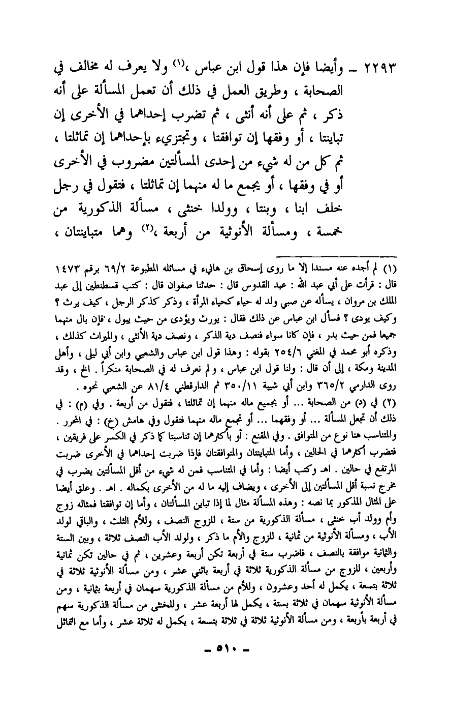 2293 - وأيضا فإن هذا قول ابن عباس، ولا يعرف له مخالف في الصحابة، وطريق العمل في ذلك أن تعمل المسألة على أنه ذكر، ثم على أنه أنثى، ثم تضرب إحداهما في الأخرى إن تباينتا، أو وفقها إن توافقتا، وتجتزئ بإحداهما إن تماثلتا، ثم كل من له شيء من إحدى المسألتين مضروب في الأخرى أو في وفقها، أو يجمع ما له منهما إن تماثلتا، فتقول في رجل خلف ابنا، وبنتا، وولدا خنثى، مسألة الذكورية من خمسة، ومسألة الأنوثية من أربعة، وهما متباينتان،