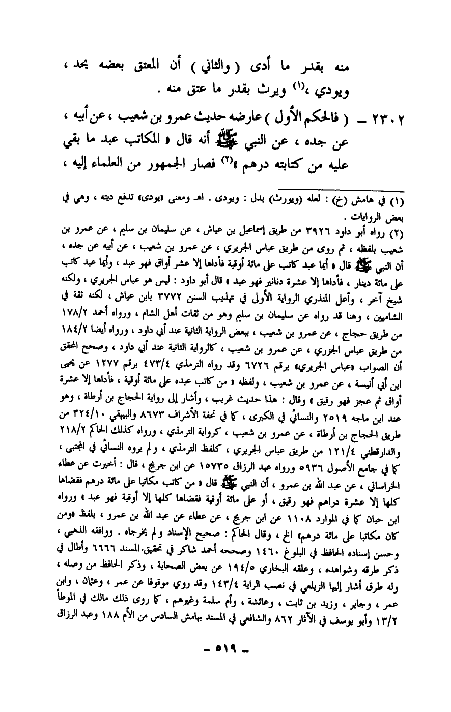 2302 - (فالحكم الأول) عارضه حديث عمرو بن شعيب، عن أبيه، عن جده، عن النبي - صَلَّى اللَّهُ عَلَيْهِ وَسَلَّمَ - أنه قال: «المكاتب عبد ما بقي عليه من كتابته درهم» فصار الجمهور من العلماء إليه،