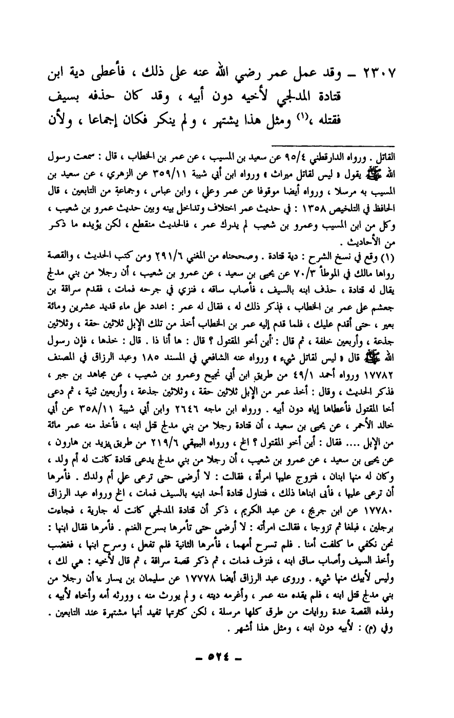 2307 - وقد عمل عمر - رَضِيَ اللَّهُ عَنْهُ - على ذلك، فأعطى دية ابن قتادة المدلجي لأخيه دون أبيه، وقد كان حذفه بسيف فقتله، ومثل هذا يشتهر، ولم ينكر، فكان إجماعا، ولأن